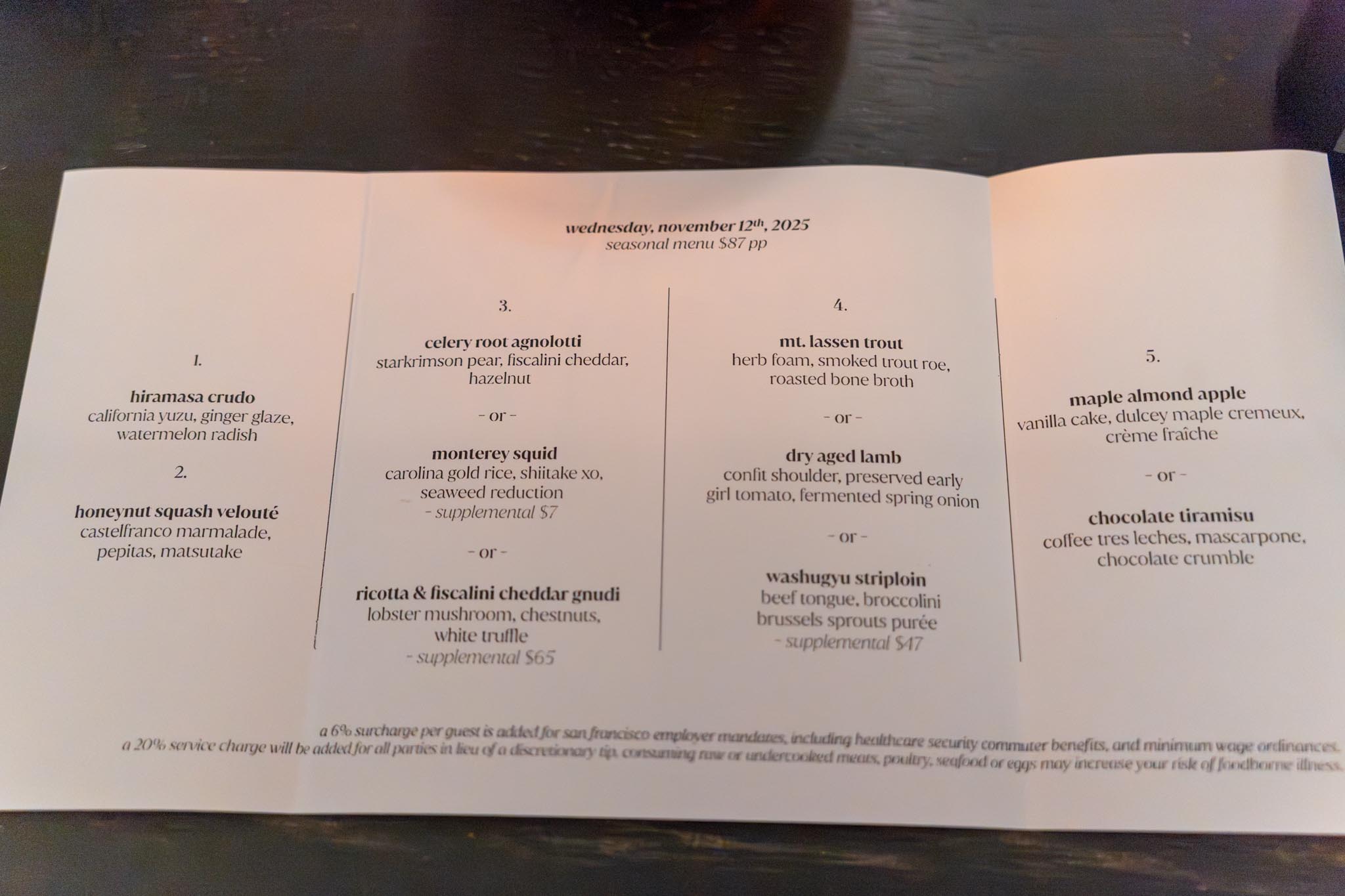 This was a bit of a random Wednesday night to eat out. Picked this place since it was reasonably priced and we had enjoyed eating here when they first opened in 2023 as well as the chefs’ previous restaurant Marlena. Restaurant was pretty busy, even at opening, which given that this is one the least expensive Michelin starred tasting menus, it’s no surprise.