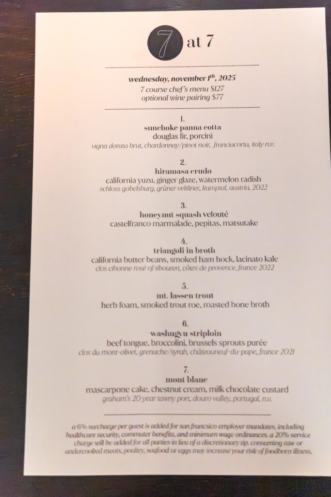 We decided to go with the 7-course Chef’s Menu since we were interested in the washugyu striploin which was going to be a $47 supplement on the regular $87 regular tasting menu (we still could have had more variety with the 5-course if Andrea and I picked all different dishes i.e. 5 x 2 = 10 different dishes) plus wine pairing.