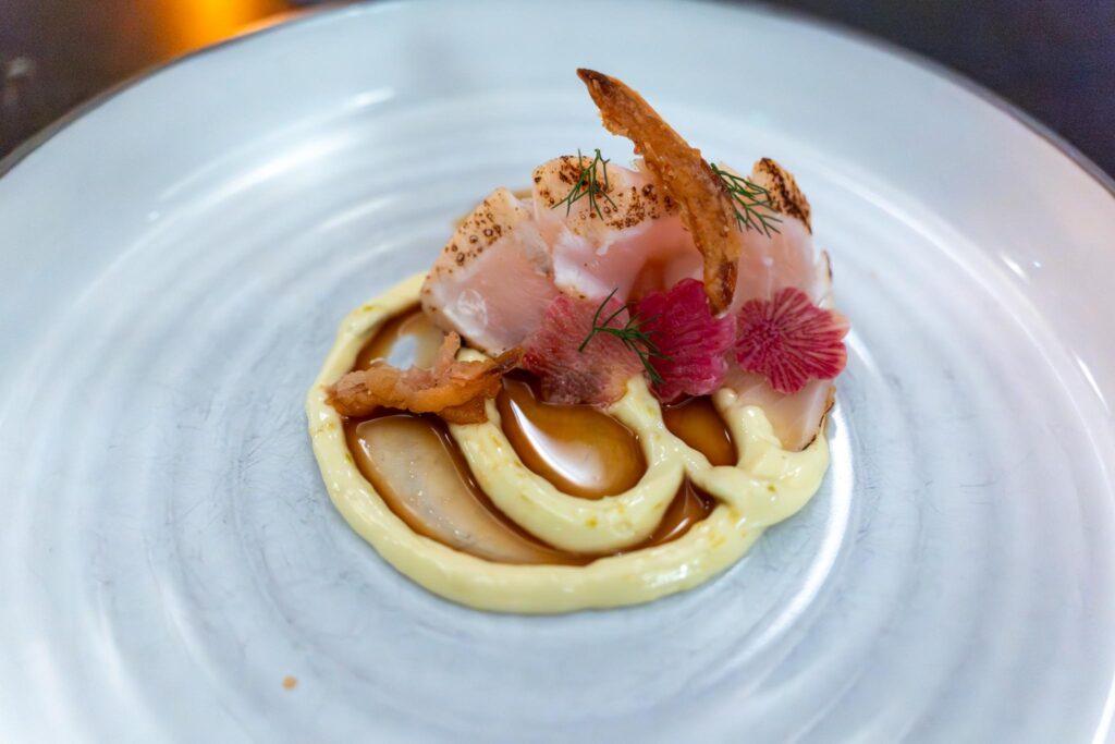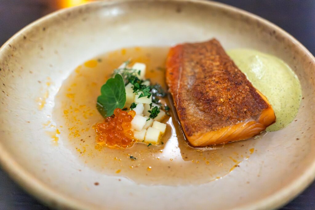 The first protein was the Mt. Lassen Trout. Thbis was roasted and served with a roasted bone broth and some herb foam and smoked trout roe on the side.