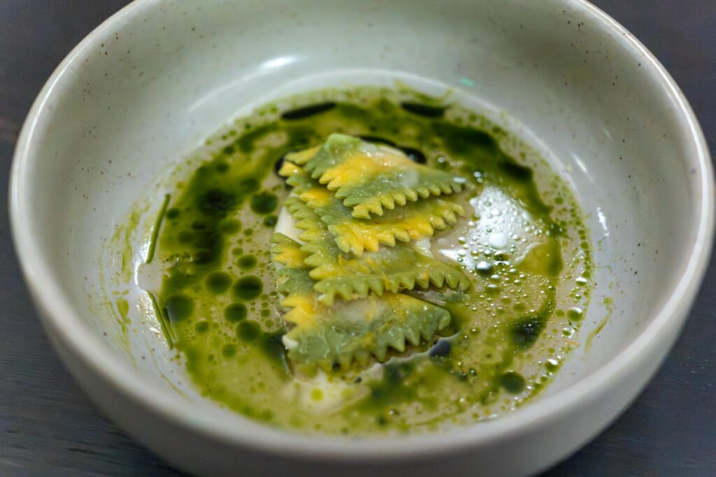 Next came the pasta, a triangoli in broth. This featured green and yellow striped egg triangle pasta stuffed with ham hock. This was set atop some blended butter beans and a light broth with kale oil.