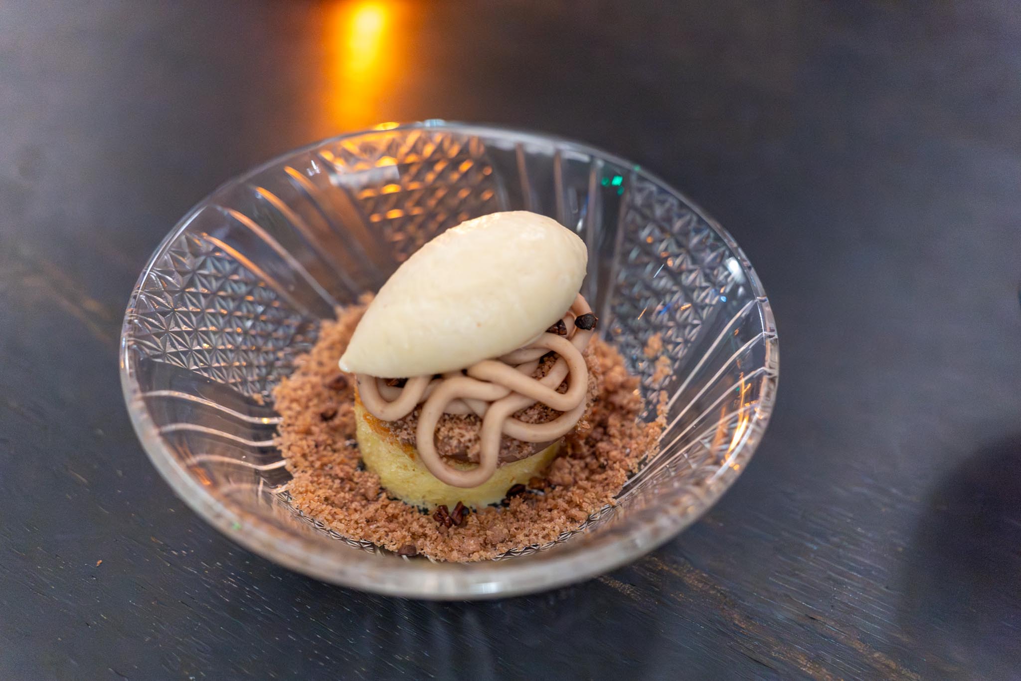 Dessert was called mont blanc which was a mascarpone cake with a tangle of milk chocolate custard topped with quenelle of chestnut cream and some nut crumble.