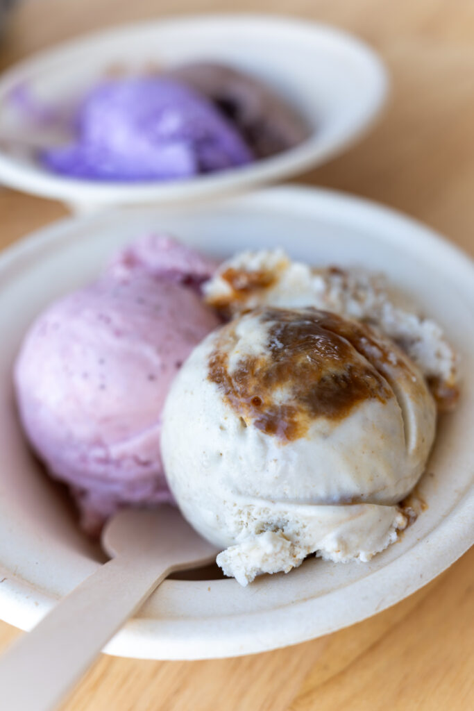 We were pretty full after lunch, but we both wanted to try a couple flavors. Andrea went with a scoop each of the Peanut Butter Crunch and the Lavendar and I went with the Honest Strawberry and the Naughty Nana. The ice creams had a very nice airy texture to them, creamy (but seemingly less heavy thanks to the airiness), and not too sweet. It was nice that the lavender wasn’t a honey lavender (as much as I love honey) because that always makes it too sweet. The strawberry tasted very much like strawberry as the Naughty Nana tasted like bananas with a small stripe of brown or caramelized sugar. We both though the ice creams were great and hope to try many more of the flavors.