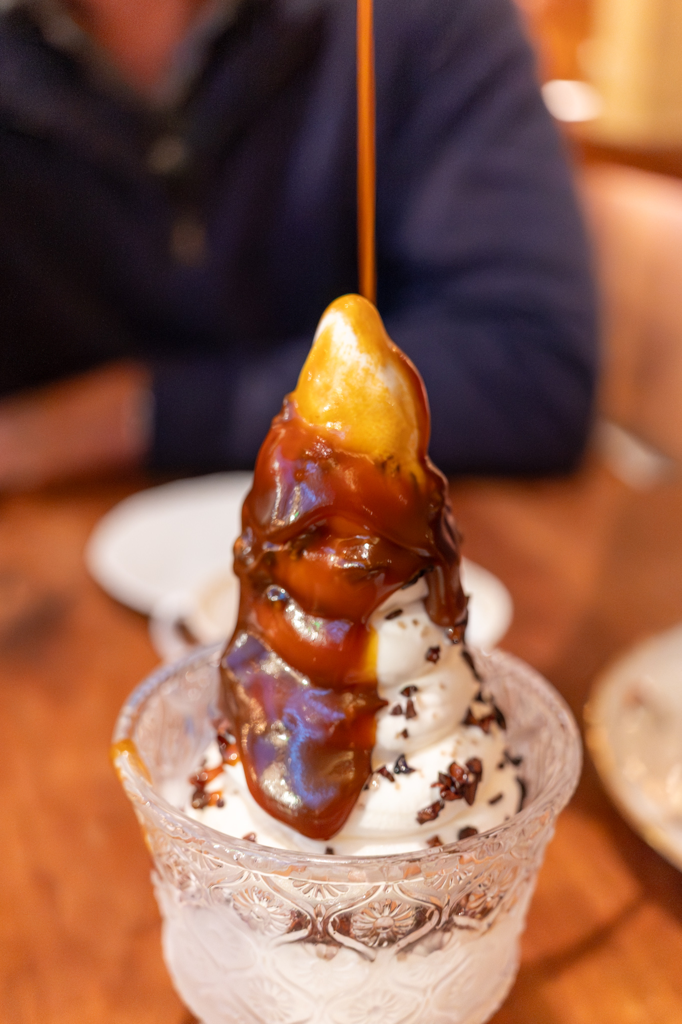 We liked the sundae/softserve and the pouring on of the caramel and all was good fun. The cheesecake tasted very much like cheese and had a savory flavor to it, so we asked what cheese they used and they said it was cream cheese! I had a 2003 Chateau D’Yquem to go with dessert and Steven had some coffee (they use beans from Sightglass).