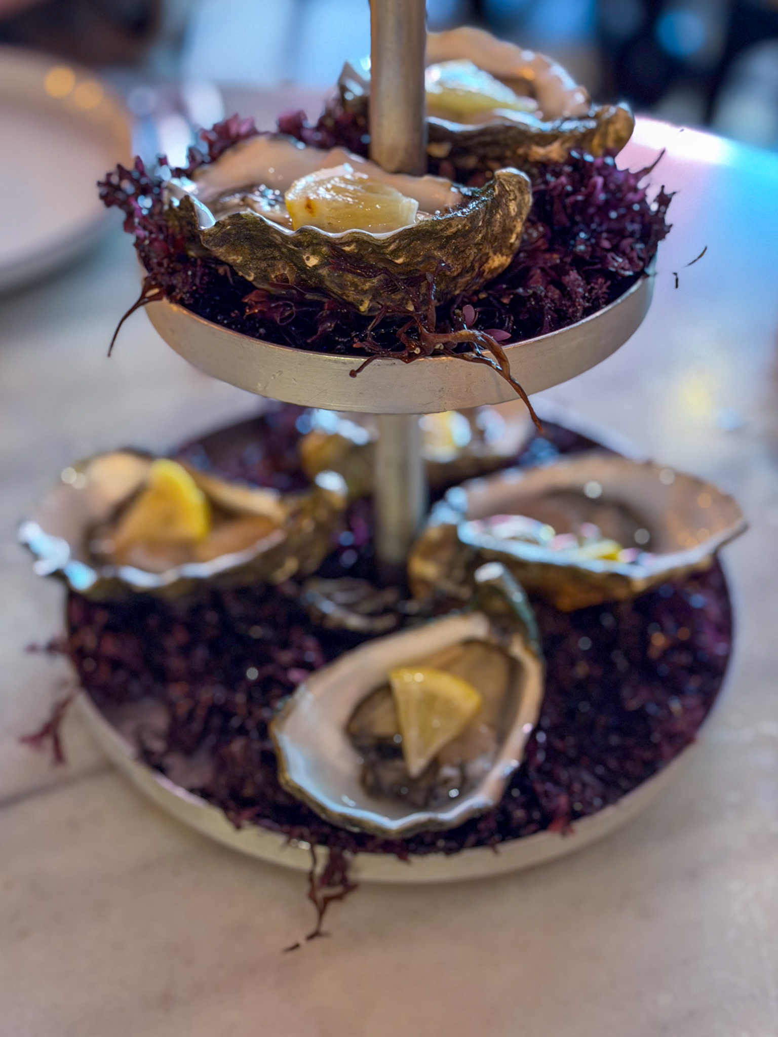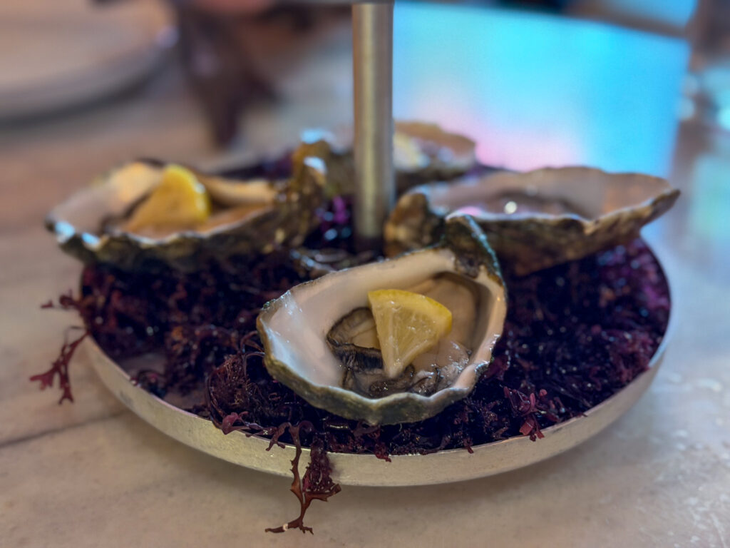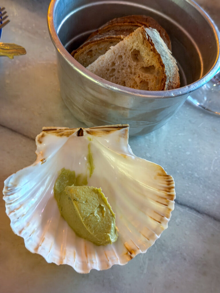 Andrea and I started with the oysters. When we asked where they were from, they told us that they came in fresh at 4am morning from northern France. The oysters were definitely fresh and very briny and also a bit too big for Andrea to ingest. So I ate the other 5. We also ordered the Bread with codium seaweed butter served in a scallop shell.