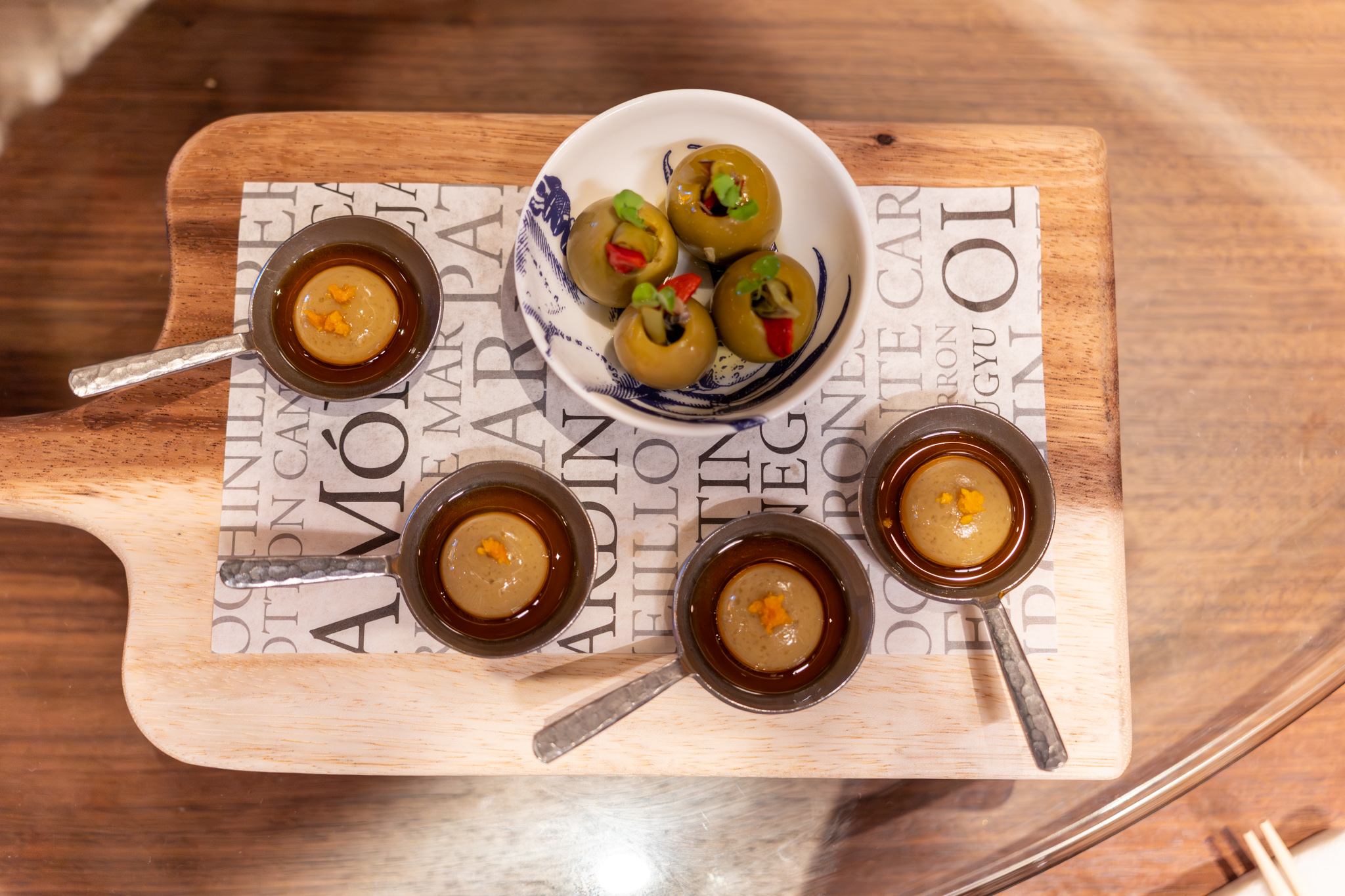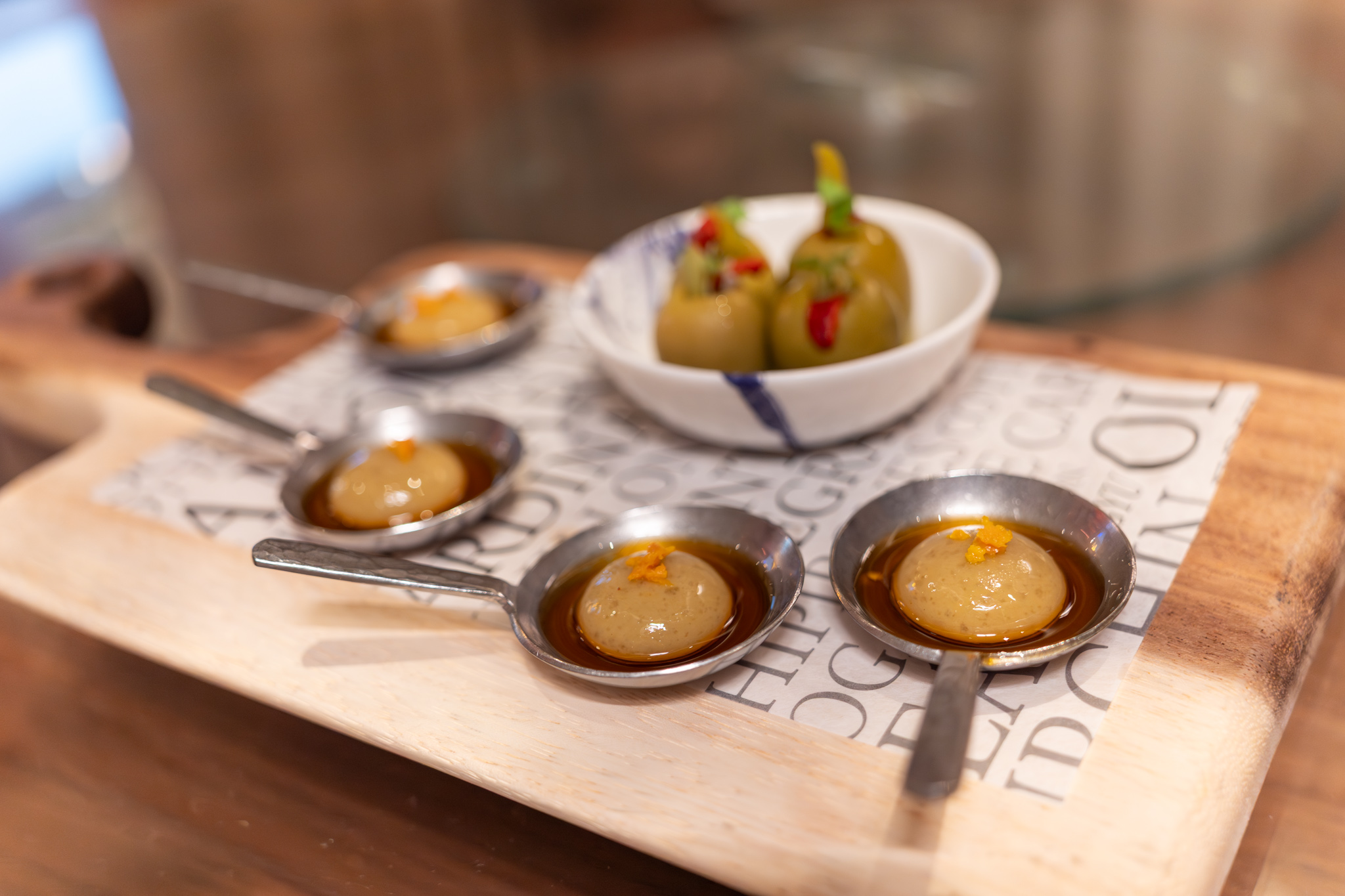 We ordered in waves of food. The first we dishes were from the Little Snacks section of the menu. First up was the Marinated ‘Ferran Adrià” Liquid Olives. This was regular olives and the molecular gastronomy olives with his spherification technique of a gel membrane globe encapsulating olive juice. It was a nice burst of olive flavor.