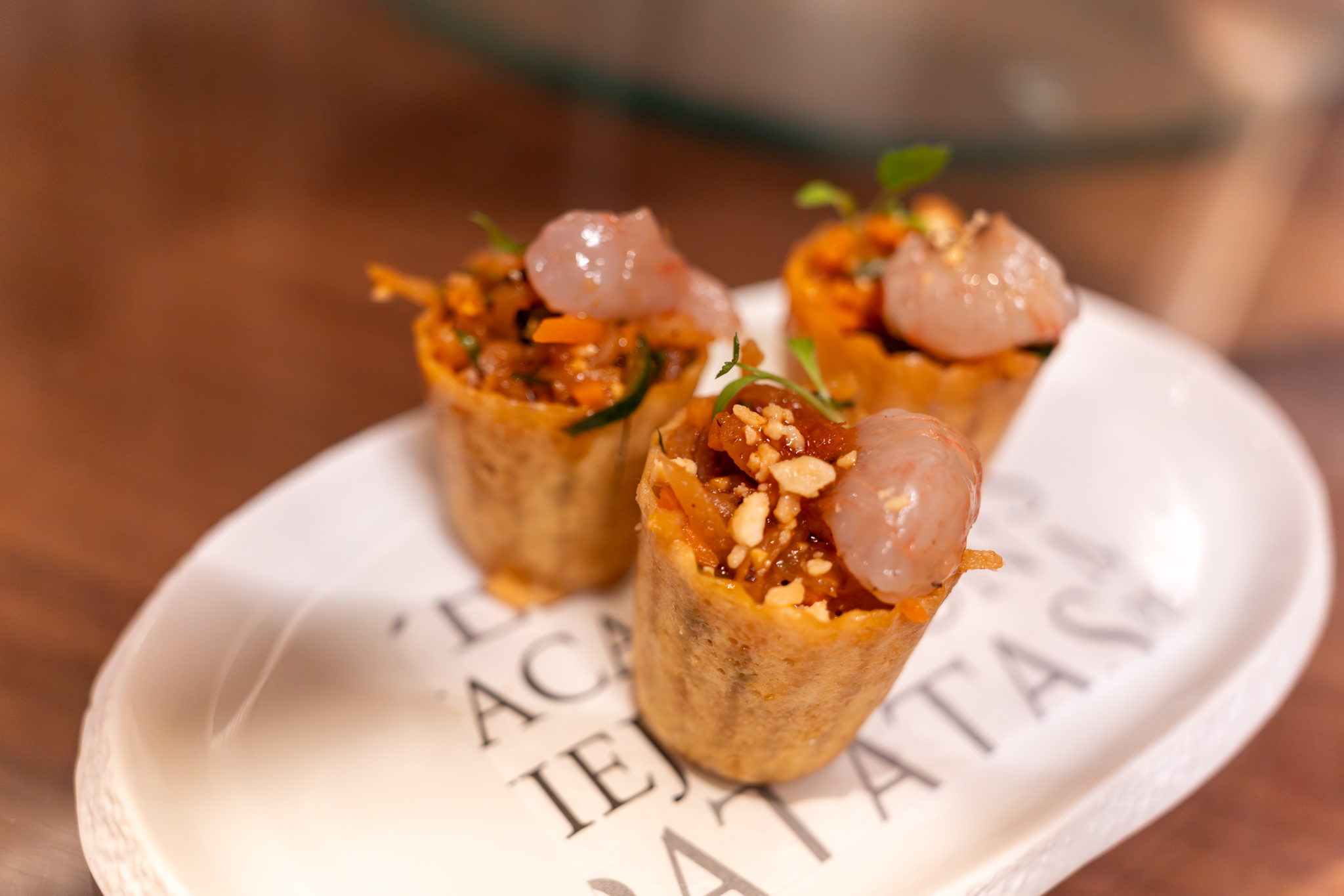 Andrea ordered the Kueh Pai Ti which was Singaporean street food. In the shotglass shaped shell, there was ama ebi, vegetables, and chili sauce and peanuts. It was delicious.