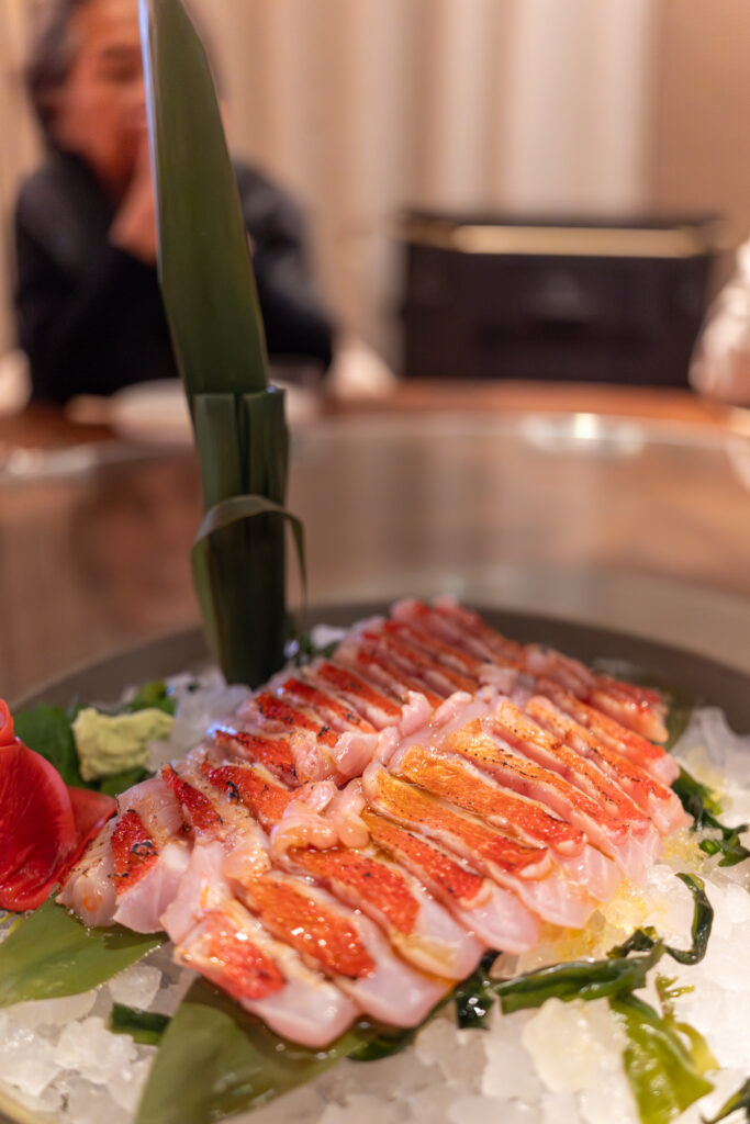 We had contemplated which whole fish dish to order. We had thought we were going to order two different fishes with different preparation, but we had eaten quite a bit already that we decided to go with the lightest option which was the Kinmedai flown overnight from Japan served sashimi style. Another striking dish with the the orange skin, lightly torched. It was good and very fresh, but since it was so fresh, it had a little bit of bite to the flesh and could have used a little bit of aging.
