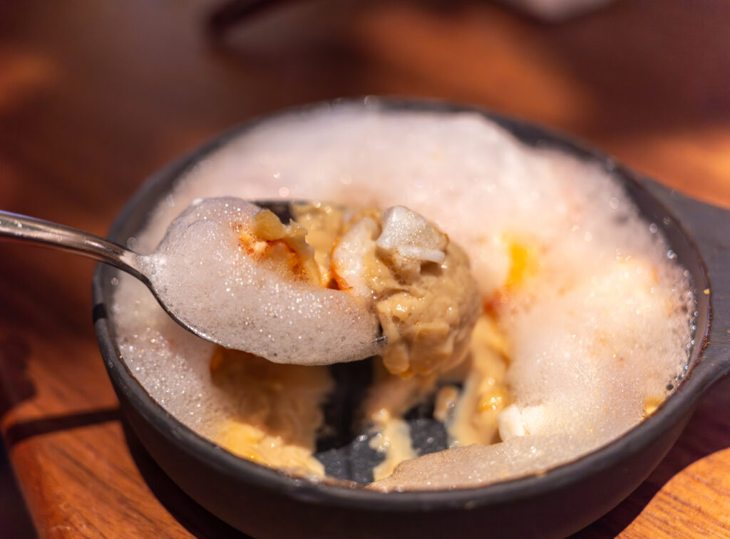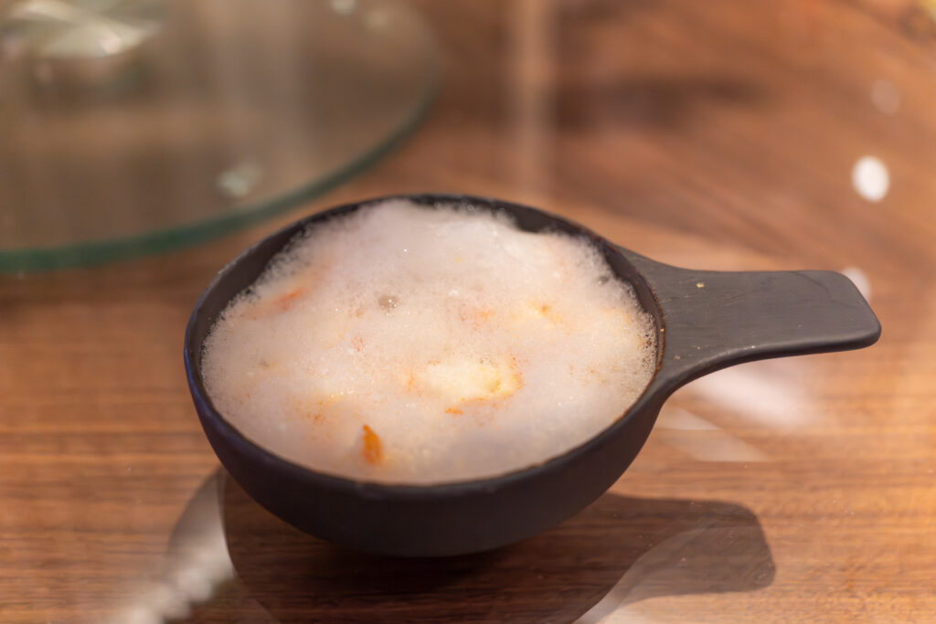 Next came the Bluefin Tuna & Fried Egg. This strips of chu toro in a rich soy-dashi broth topped with a fried quail egg. To eat this, your spun the otoro onto your fork. This was very flavorful and rich and a nice contrast to the scallops.