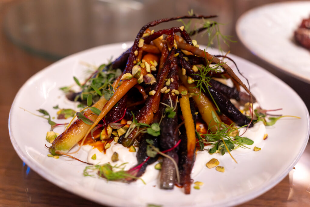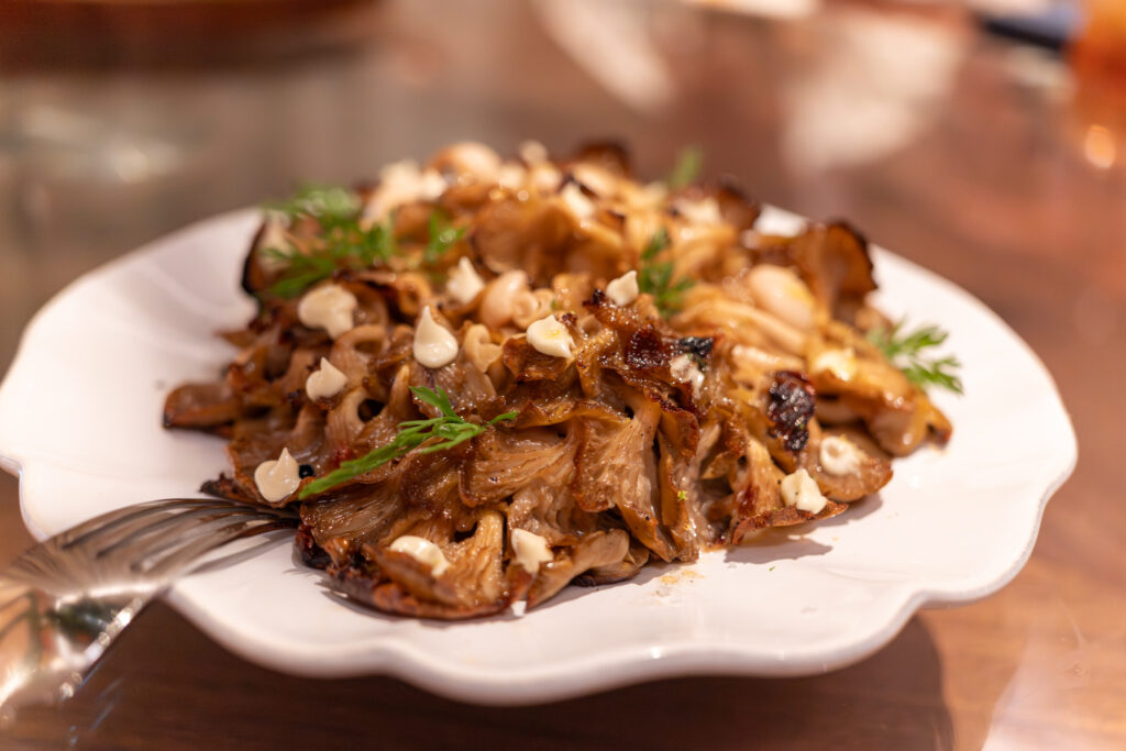 A couple of our salads and sides came out – and the Oyster Mushroom “Sea Anemone” and the Josper Roasted Carrots. The oyster mushroom came as a couple large interconnected pieces and was topped with little dabs of anchovy aioli. This was also an umami bomb and Andrea loved it (anchovy aioli was mild) because of such a rich mushroom flavor to it all. The carrots looked quite good with a variety of colored carrots, atop some olive oil labneh and topped with a carrot gastrique and some pistachios for texture. It sounded good by description, but I only thought it was ok, a bit heavy.
