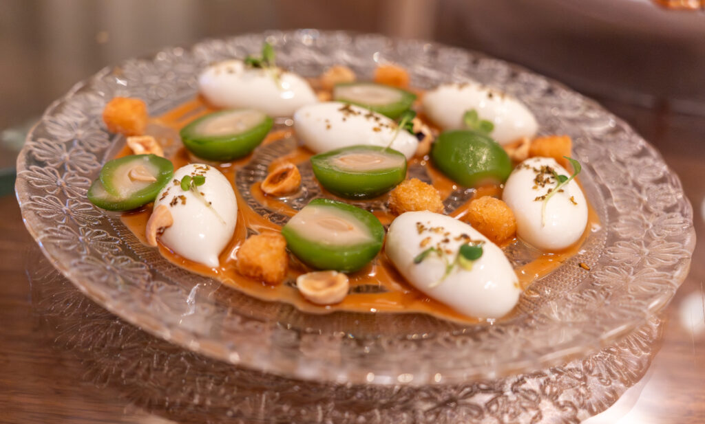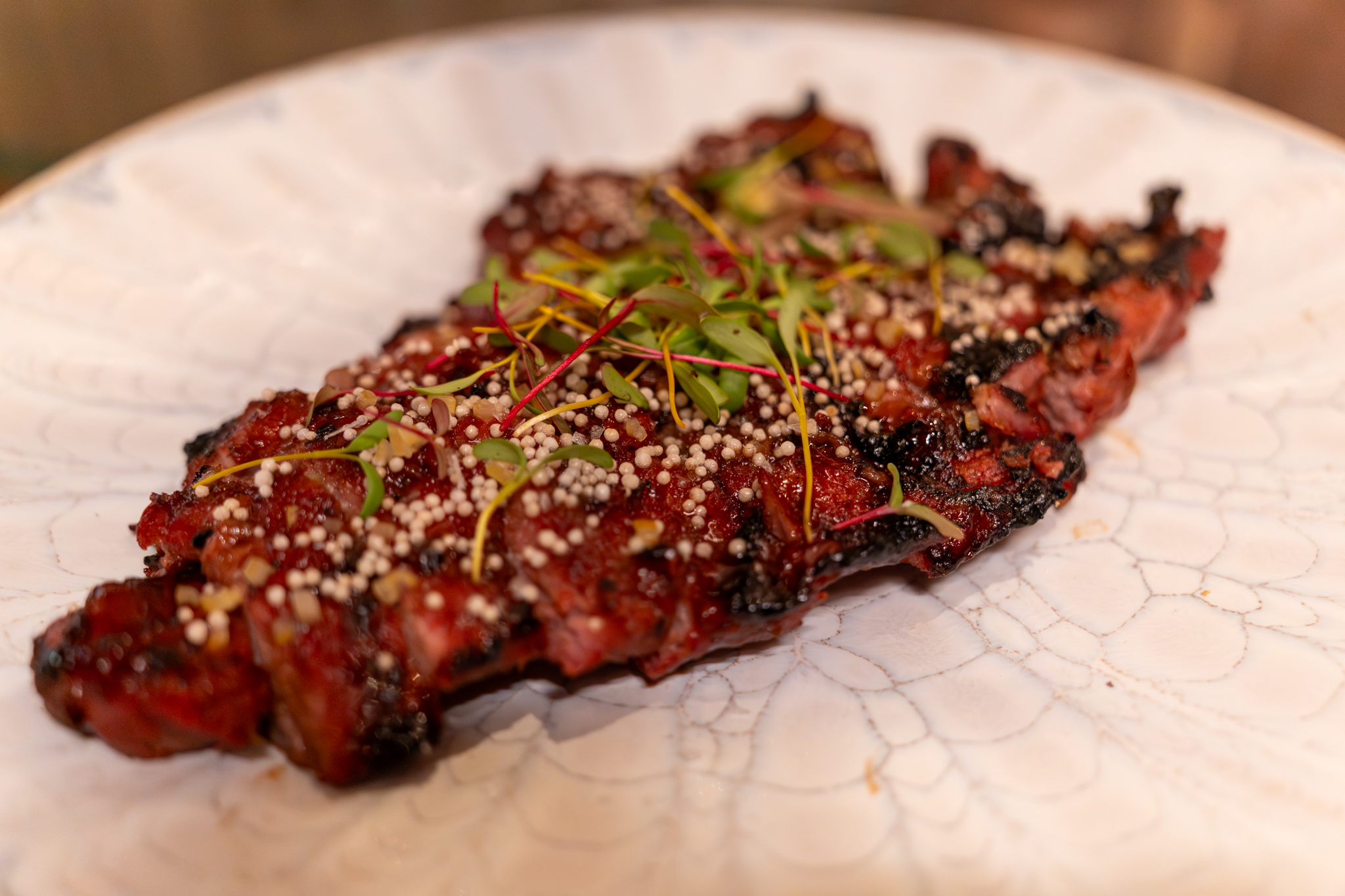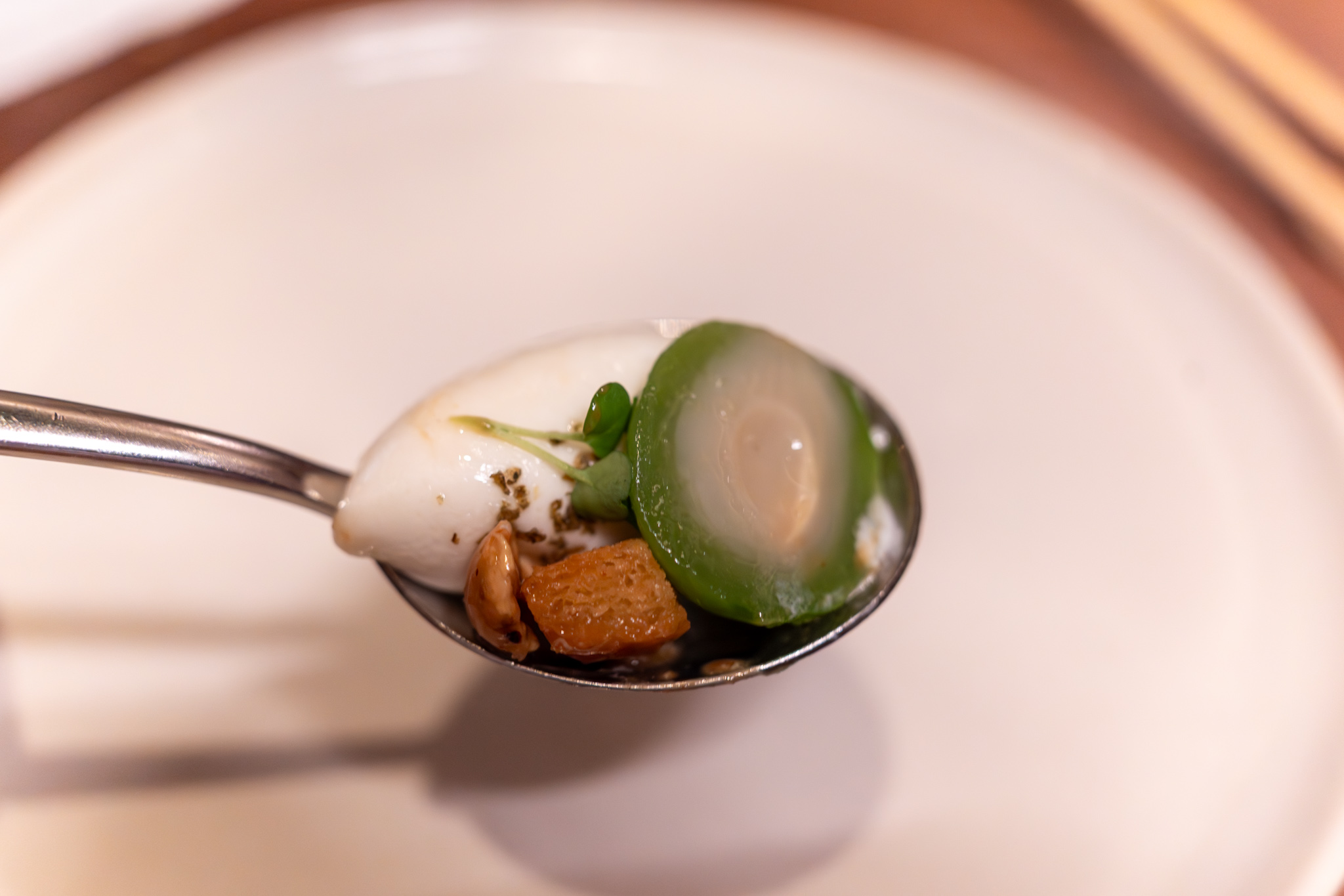 We had one more meat dish and one more salad. The meat was Miso Glazed Secreto Iberico. I’m a sucker for miso glaze and the pork was so very tender. For me, this was an incredible pork dish. The salad, which they intentionally served towards the end because it was quite savory was the Japanese Baby Peaches. The peaches are quite distinctive due to their green color and small size. This was served with spoonfuls of stracciatella dusted with some zatar, toasted hazelnut halves, and some mini croutons. Assembling a bit of every component made for a great bite.