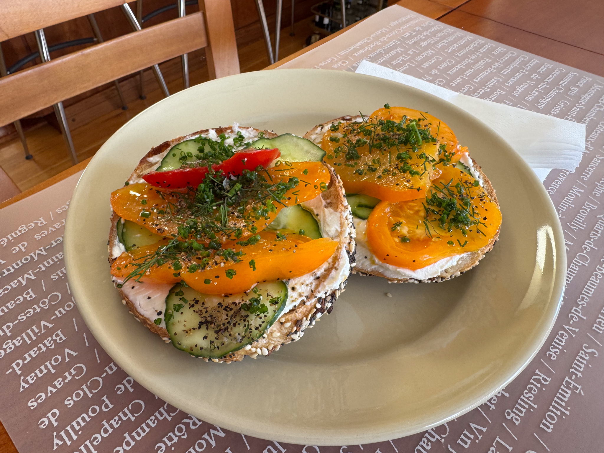 Andrea’s veggie sandwich looked quite cololrful with the tomatoes and cucumber. it seems like some ingredients were missing from what they had listed on the menu and we had also ordered chili oil drizzle for $0.50 which they seem to have missed. But all in all, this was pretty good although I’d personally still rather get the smoked salmon bagel sandwich.