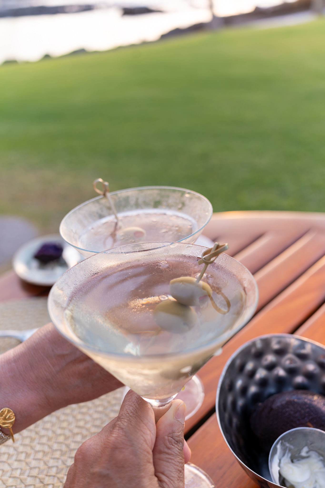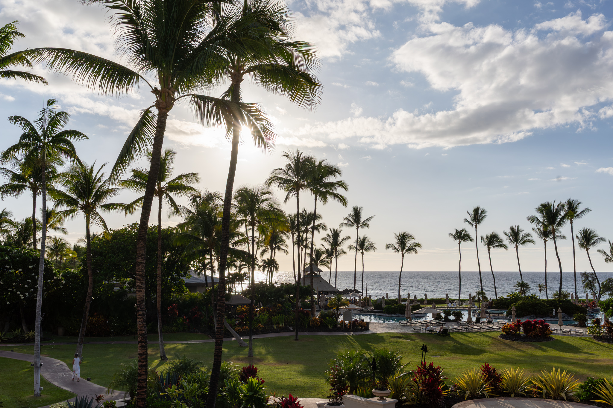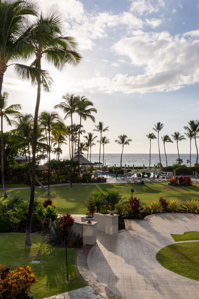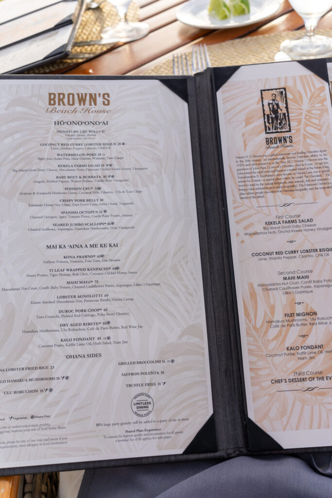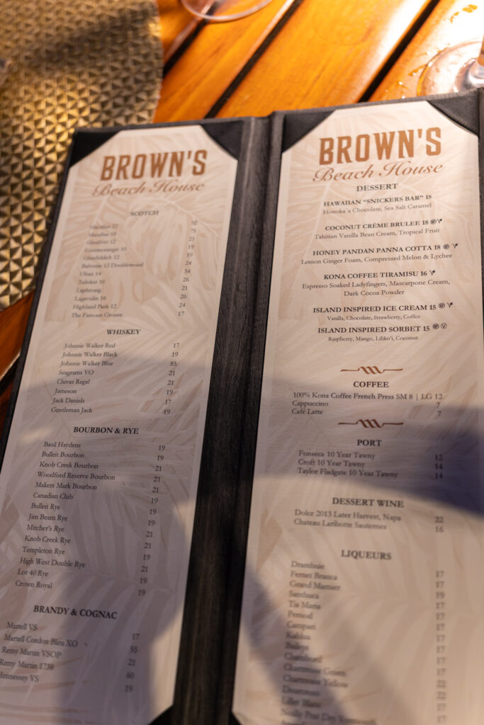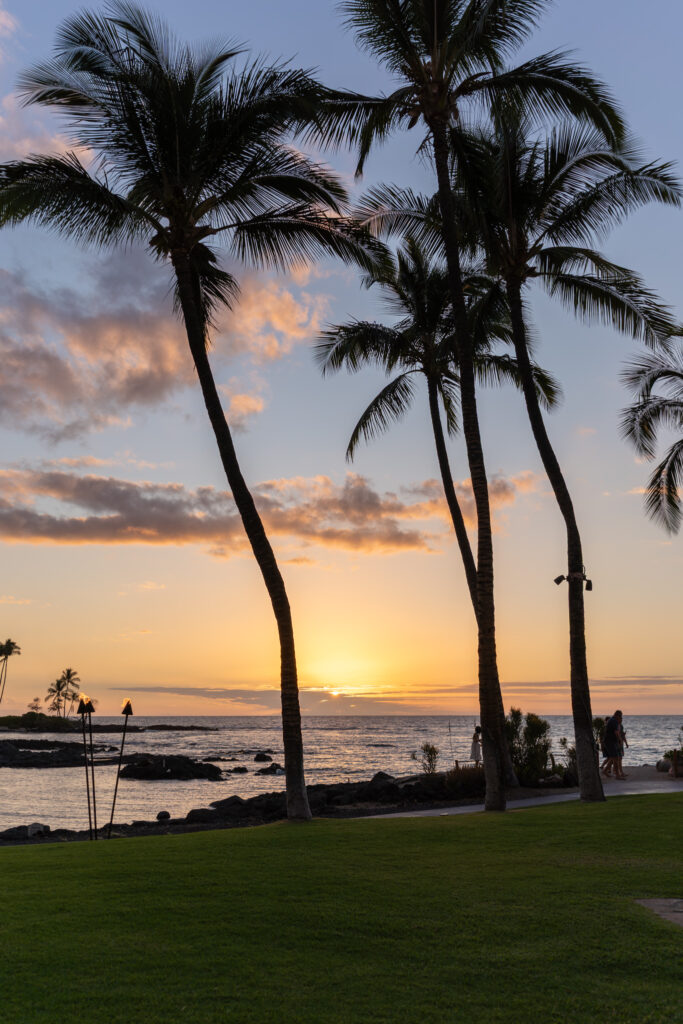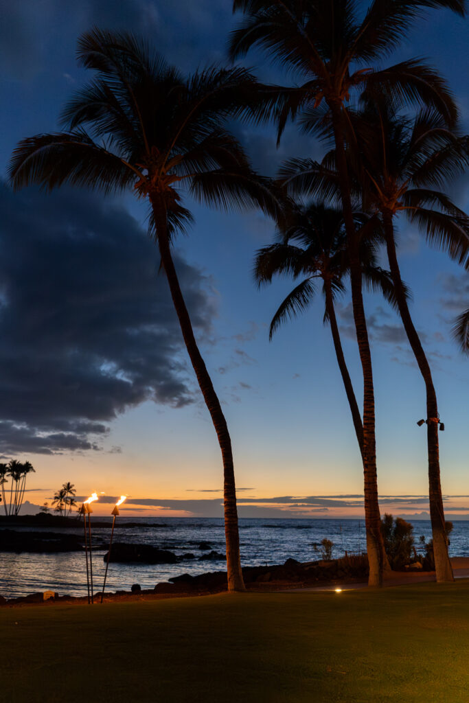 This was our penultimate night here on the big island. I booked us at the nicest of the dining options at the Fairmont resort. It was clearly a much nicer resort than any of the Hilton Waikoloa properties. Since we had an early seating (5:45 and the restaurant opened at 5:30), we were seated in one of the front row tables closest to the beach so we’d have an unobstructed view of the sunset.