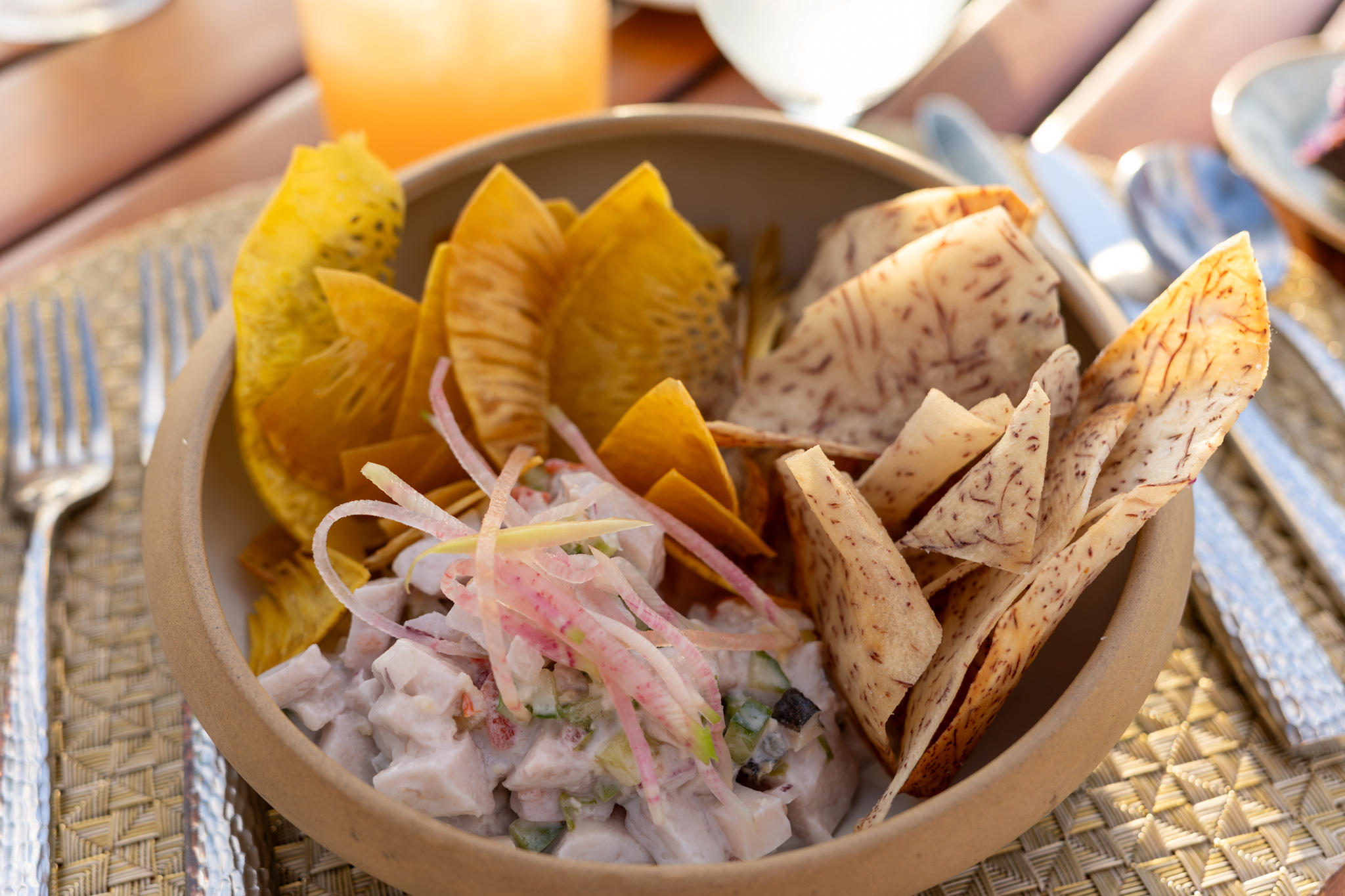 There was a prix fixe menu, but we didn’t think enough of the choices to go with that so we just ordered à la carte. For starters, Andrea ordered the Coconut Red Curry Lobster Bisque (which I had also been eyeing) and I ordered the Poisson Cru (I was also tempted by the poke, but we did have some yesterday for lunch at Hilo Bay Cafe). The lobster bisque was a very nice bisque with well developed lobster flavor. My dish was a sort of Hawaiian ceviche made with abalone and kanpachi with citrus juice, coconut milk, and cilantro accompanied by some ‘ulu and taro chips like you would find with poke. This was also quite delicious. Very good start!
