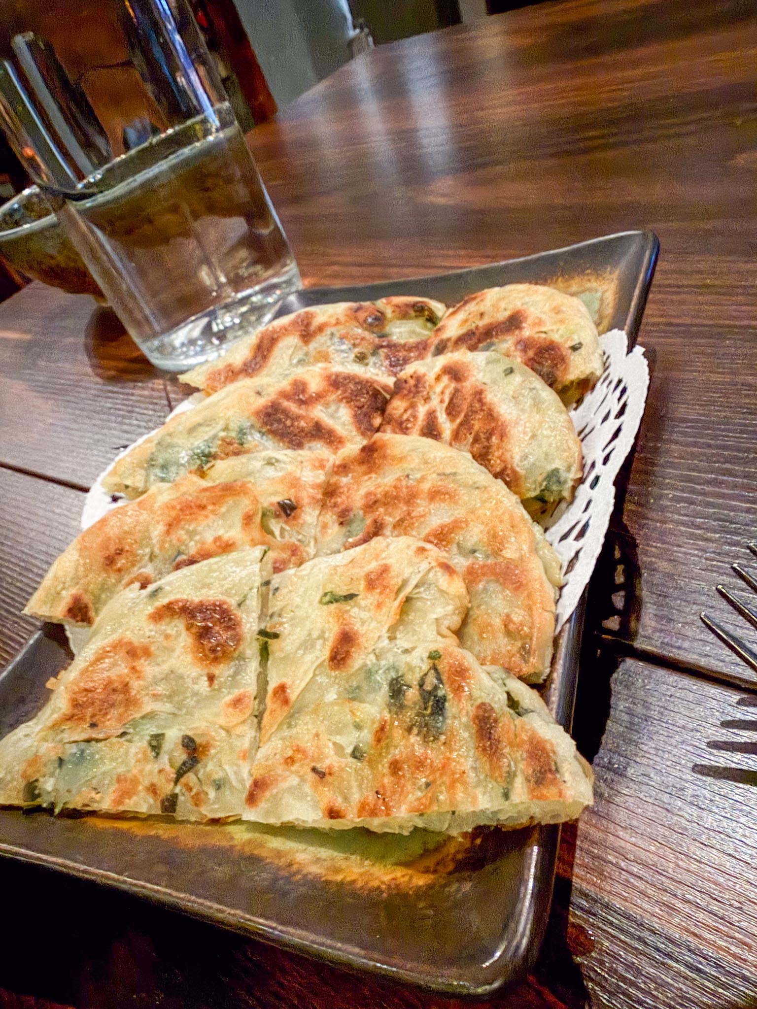 Andrea has been under the weather and had a craving for some hot and sour soup. So we ran some errands and then stopped off at Dumpling Kitchen for dinner. She ordered the Hot and Sour Soup and the Dry-Braised String Beans. I was determined to order things that we had not previously ordered here, so I went with the Green Onion pancake and the Szechuan Fish Fillet w/ Pickled Cabbage in House Broth since I was very interested to try something with some Szechuan pepper today. So we didn’t order any dumplings at Dumpling Kitchen this time, lol.