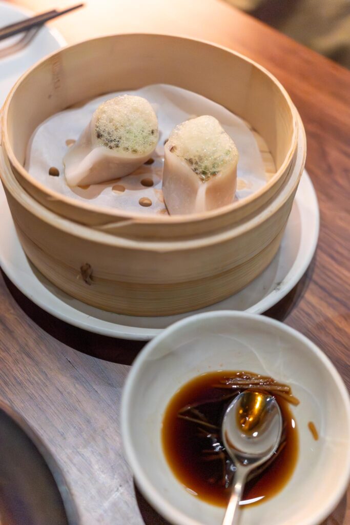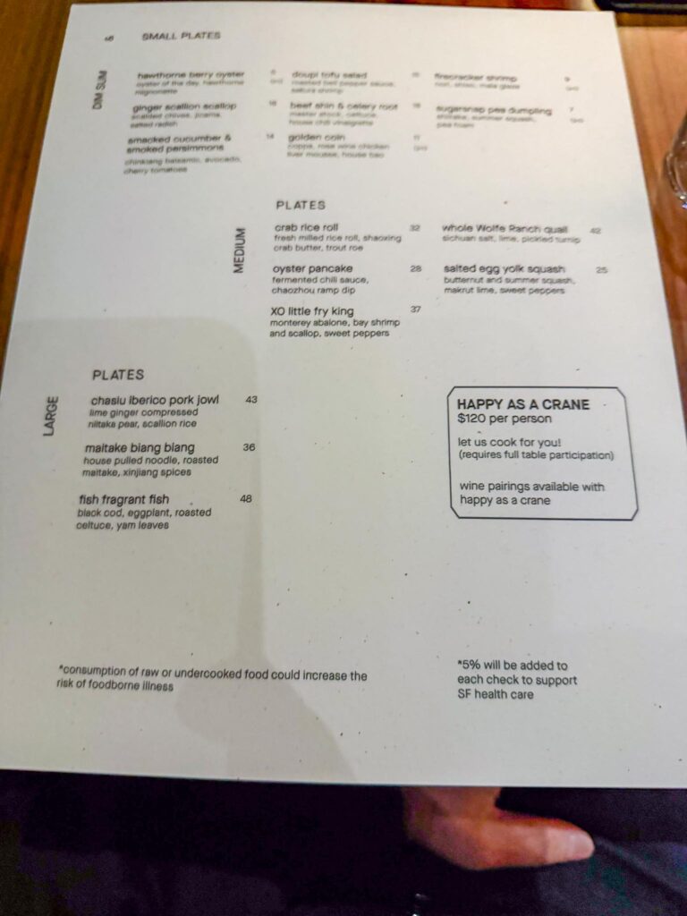 Menu looked very interesting. It’s a modern Cantonese menu with a bit of California influence. The menu is divided into sections for Dim Sum & Small Plates, Medium Plates, and Large Plates. There is also an option for the set menu called “Happy As a Crane” for $120, which is what we opted for. I also went ahead and did the wine pairing so we could see what it was all about. The waitperson mentioned that the pairing was $155 and checked to make sure that was ok, which I was fine with although that is pretty steep for a menu that is only $120. At that price point, I suspect they don’t get a lot of pairings, but I’m always curious what about pairing with Chinese food, so I wanted to see.