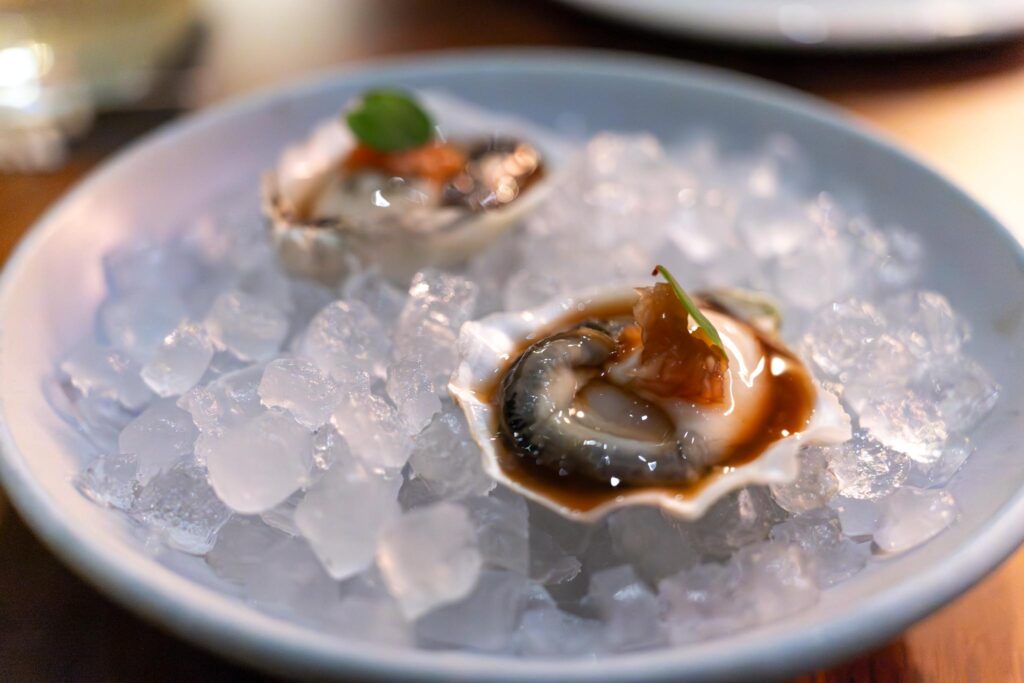 First bite that came out was the hawthorne berry oyster. They oysters were from Washington (can’t remember the type). We always enjoy oysters at the start of the meal and the Roederer champagne was of course a decent pairing (and would be paired with the first several dishes).
