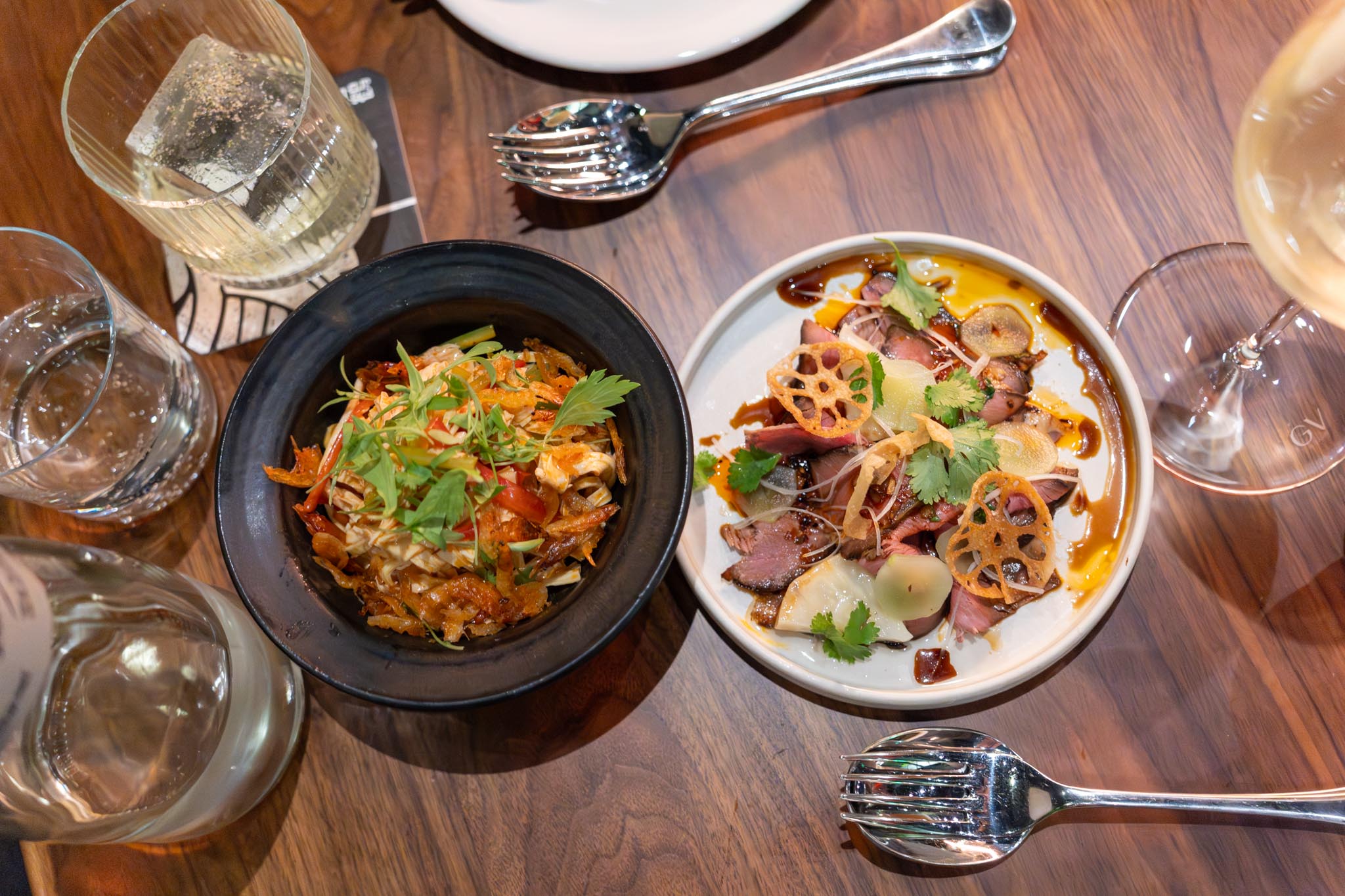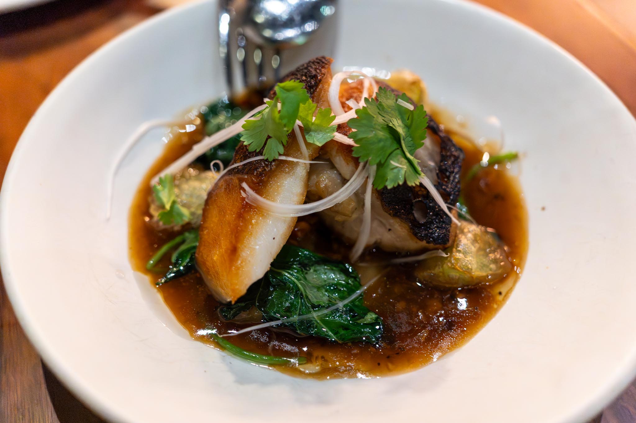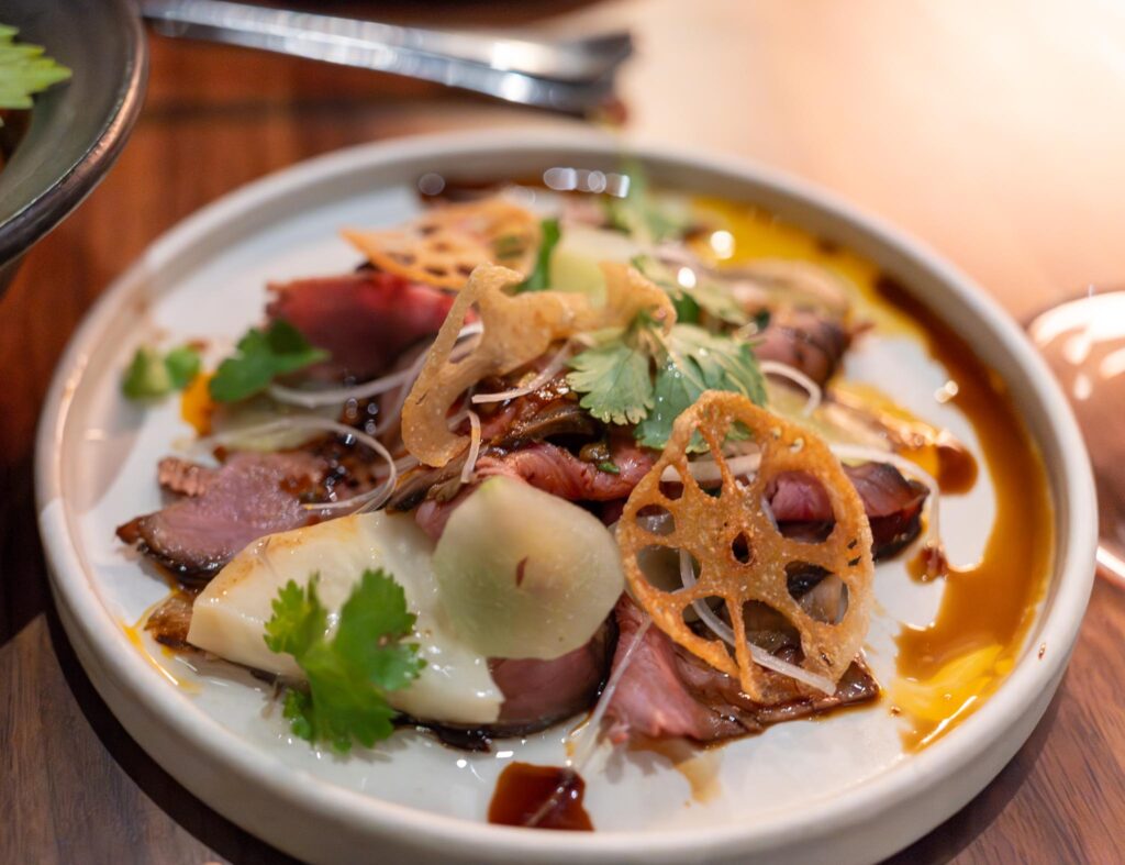 Next dish was the golden coin. This was a flat open face buttered bao bun with a chicken liver mousse spread on top and this in turn was topped with a small heap of coppa (pork shoulder). We were blown away with this dish. It was incredibly delicious with the chicken liver giving another layer of flavor and richness.