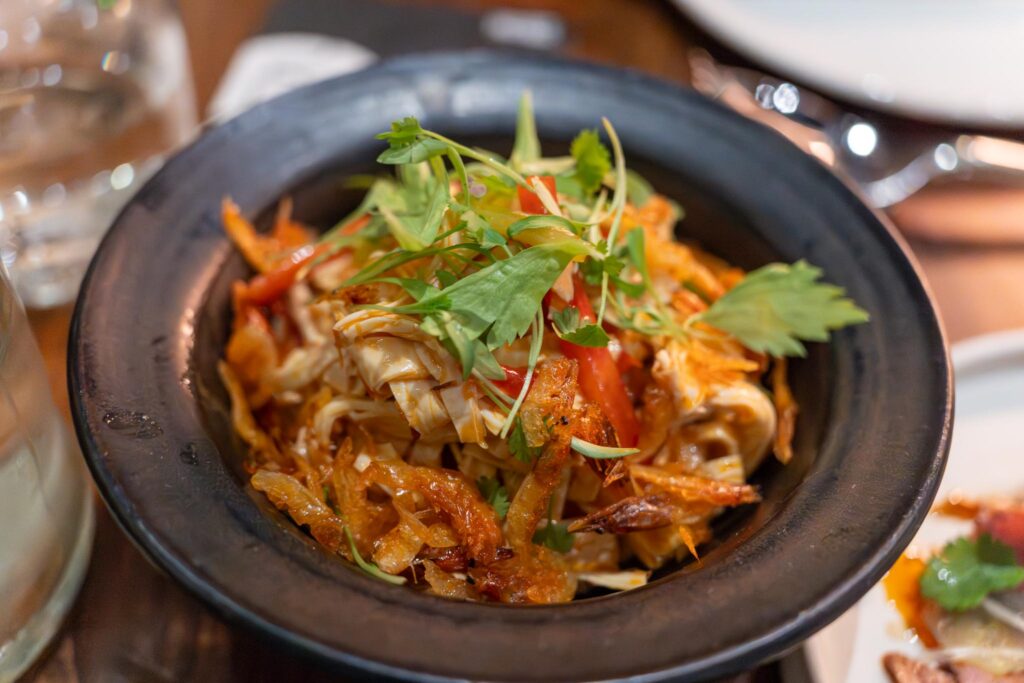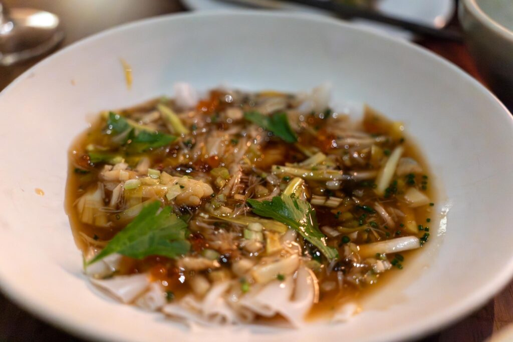 Next up came a pair of dishes, the beef shin & artichoke dish and the doupi tofu salad. The tofu salad was made up primarily of tofu skin, which by itself is relatively bland, but it had a nice bell pepper sauce and little fried shrimp that provided a burst of flavor and a bit of texture. Ultimately, we would not finish this dish partially because we were wary of filling up too soon. The beef shin though was fantastic with great flavor from the house chili vinaigrette and the master stock. The pieces of fried lotus root also added a bit of texture.