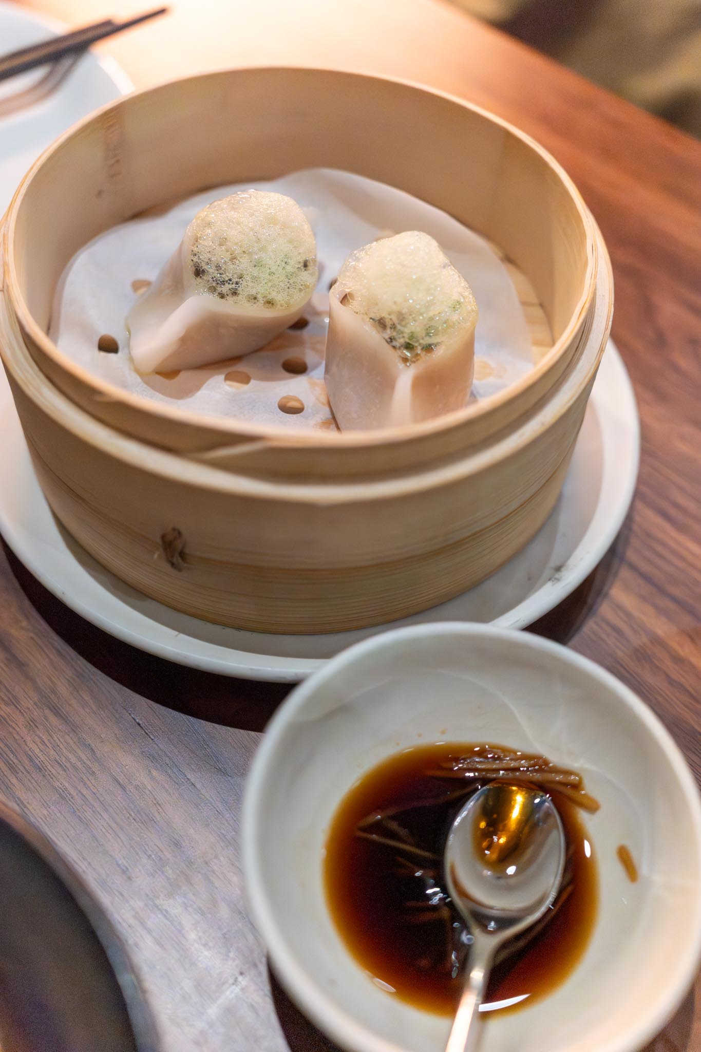 There was a bit of lag in service before our next dish arrived, the sugarsnap pea dumplings. This is one that Andrea was very interested in when she saw the menu since she loves snap peas. The dumpling was open on top and topped with some pea foam. The open dumpling made it a bit floppy and challenging to pick up with chopsticks and eat and we both failed a bit in picking it up. It was good, but not our favorite.