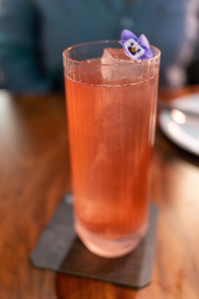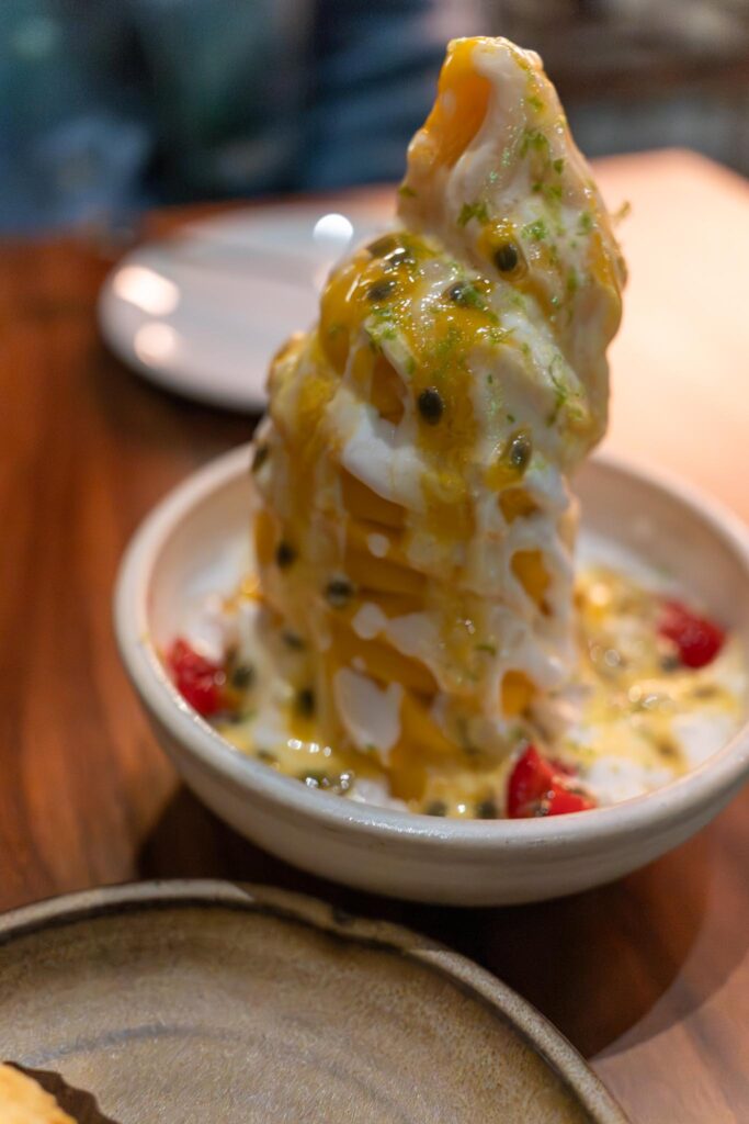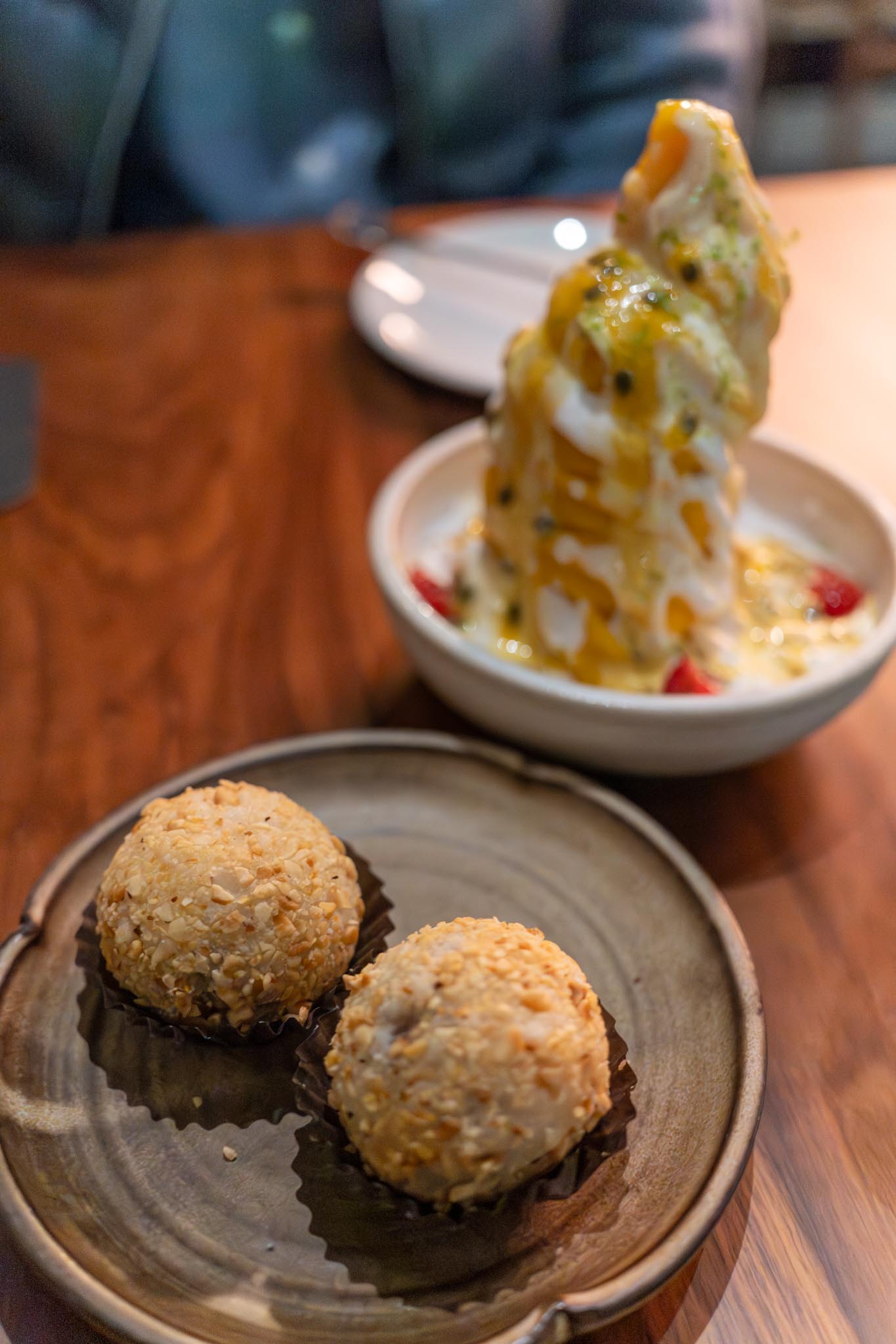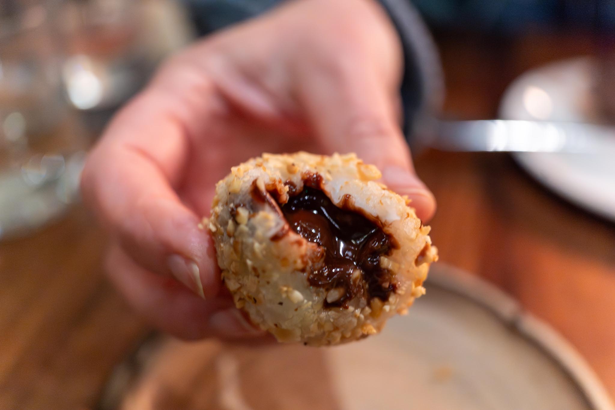 Dessert included two items, one was the mango & raspberry sorbet which is a mango softserve with some passionfruit with the seeds giving a bit of a pop, a few raspberries, and some coconut sago with tapioca pearls. The dessert was quite big so we couldn’t finish, but we did have room for the second dessert which was the mochi rocher which is their take on the Ferrero Rocher that we’ve all had before, but in this case it was made with mochi with a some sesame with a warm liquid chocolate ganache in the middle which was a perfect ending to the meal.