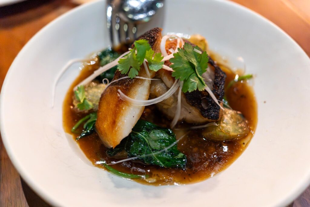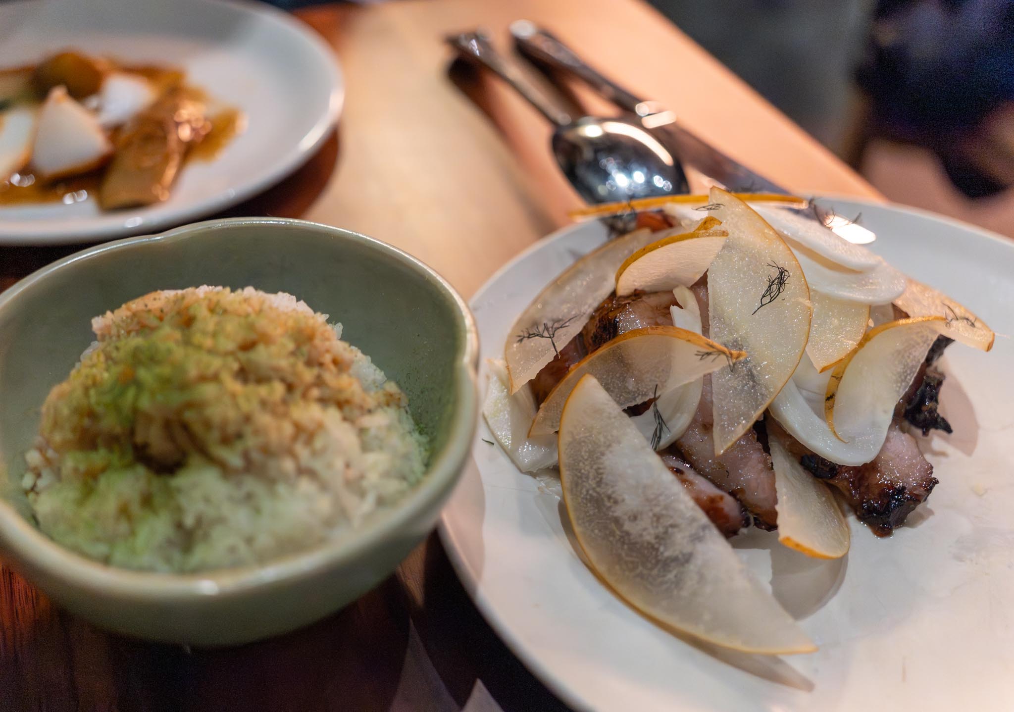 Our first of two Large Plates was the fish fragrant fish. The lingcod was browned nicely with crisp skin and fairly heavily salted which I quite liked. The second Large Plate we received was the chasiu Iberico pork jowl. We were getting qutite full by this point so this was a pretty decent amount of glazed sliced pork jowl topped with limg ginger compressed apple, fennel, and a side of scallion rice. The chasiu was relatively light since it was only on the edges of the pork and some pieces were quite fatty. We couldn’t finish, but we did take it to go since I figured I could make a good meal of leftovers out of this.