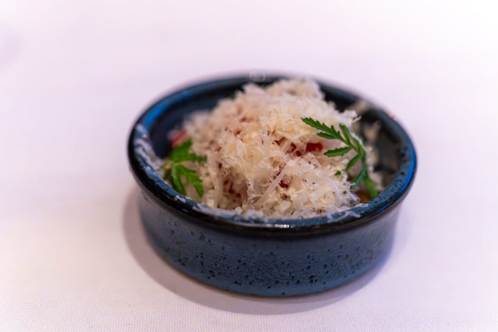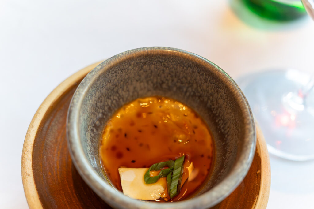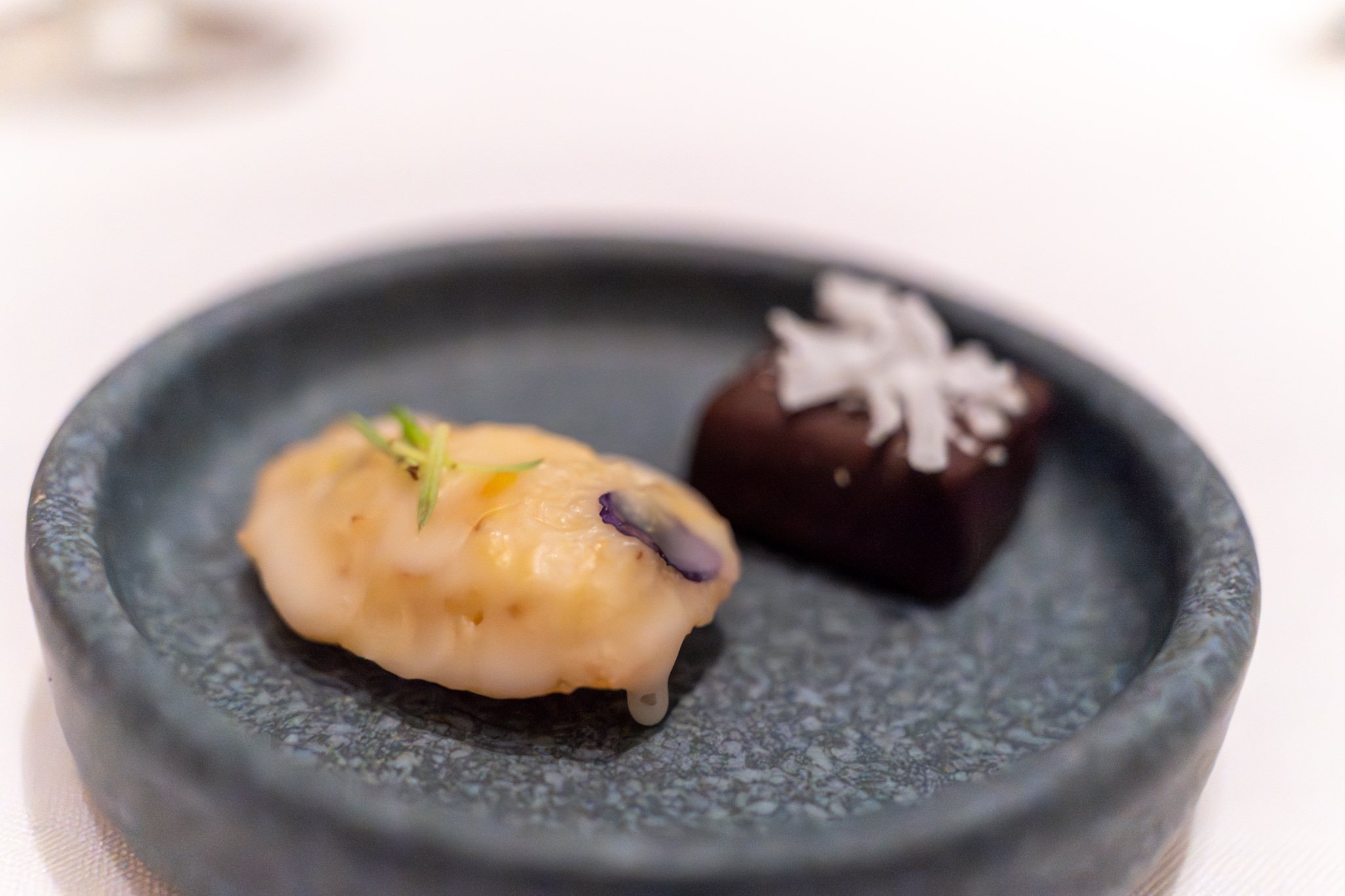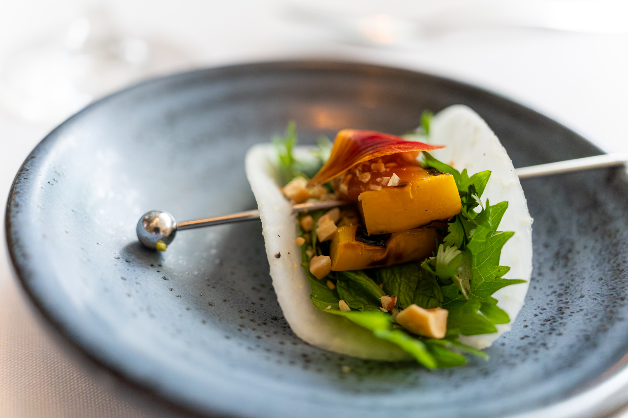 The first bite/amuse bouche was a fresh fruit tart. This was also followed by another bite of a mini taco with shiso leaf, local squash, hazelnut and had a nice fresh flavor from the ingredients.