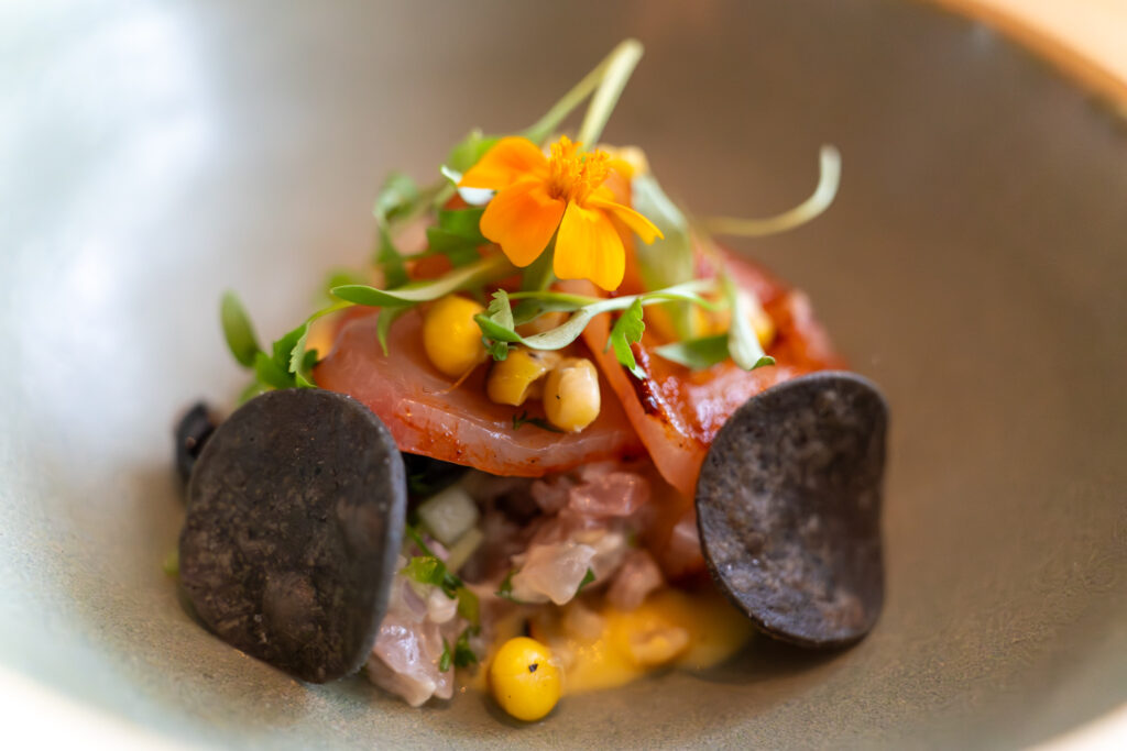 The first true course was the Hamachi Crudo en Adobo. It featured corn from local producer Alsum Farms, some blue corn tostaditos, and a pico de gallo. It was ok, but I’m generally wary of crudos since I of course expect the fish to be very fresh and this was decent, although we’ve had our share of better hamachi.