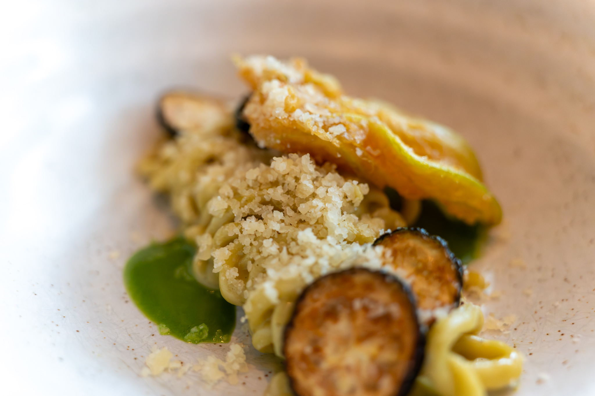 Next came the Spaghetti Alla Chittarra which is a square cut spaghetti. This included some grilled zucchini from Roots Down Farm, a delightful lightly fried squash blossom, Pecorino Raomano, Big Sky Grana from Bleu Mont Dairy, and bit of basil sauce. Another nice dish with local ingredients.