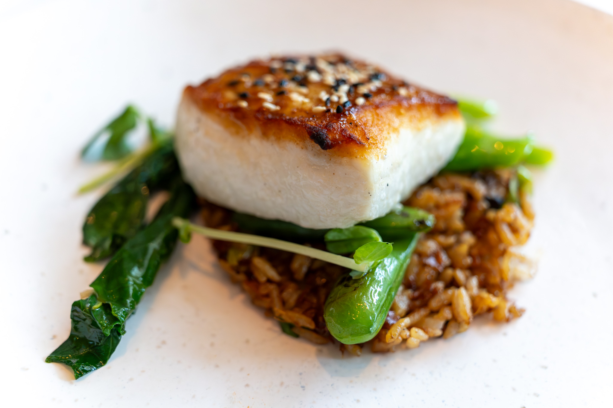 Our next course was the Alaskan Halibut Char Siu. This dish came in two parts, one part Chinese inspired and one part Japanese. The fish was sprinkled with sesame and roasted and set atop some gai lan/Chinese broccoli, snap peas, and porcini mushroom-XO sauce fried rice. The Japanese part came in the for of the king crab chawanmushi with yuzu ponzu. We eat a lot of Asian food including char siu pork and chawanmushi and unfortunately, these seemed very bland renditions of a Chinese and Japanese (to be fair, we’ve also had plenty of meh chawanmushi here in SF too and this was not neccessarily any worse than any of those, but that didn’t make this very good).