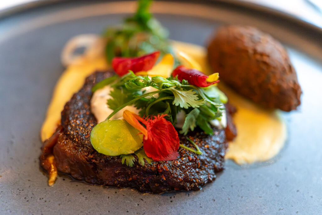 Our first meat course was the Pinn-Oak Ridge Lamb Spare Rib Shawarma. This is was described as compressed lamb seasoned with shawarma seasoning. This was topped with a cucumber yogurt and some cilantro, fava beans halves, and some other red herb/flower. There was also a sumac-sweet onion salad and a Jones Valley Farm fava bean falafel. This was all set atop some fava bean tahini and a which made for a colorful plate. Again, I found this to be a weak and relatively bland rendition of another ethnic dish/cuisine.