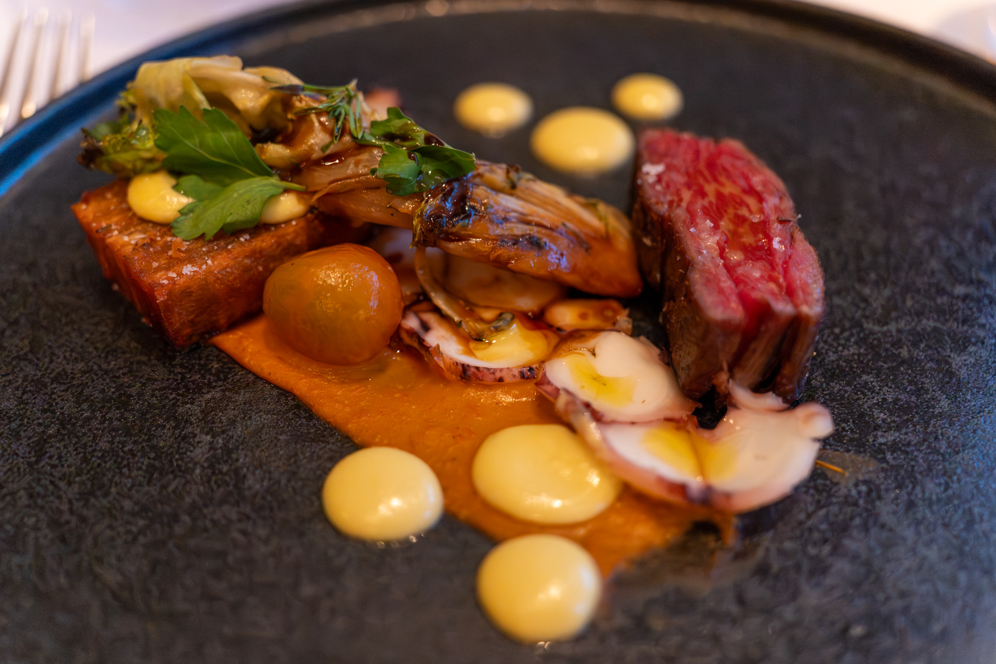 The last savory course was the New York Strip from Son of a Beach Farm. This was also served with slices of Spanish Octopus, a sort of layered potato that they called patatas bravas (not like any patatas bravas I’ve ever had…), a red sauce that I assume was supposed to be a mojo sauce to go with the patatas bravas, a bit of sautéed escarole/endive from Squashington Farms, sungold tomato, and rosemary aioli. The octopus was chewy, so I didn’t care much for that, but the steak was cooked perfectly and with the aioli had a very strong rosemary flavor. Some might find that overpowering, but we are quite fond of rosemary and did enjoy the dish on the strength of the steak.