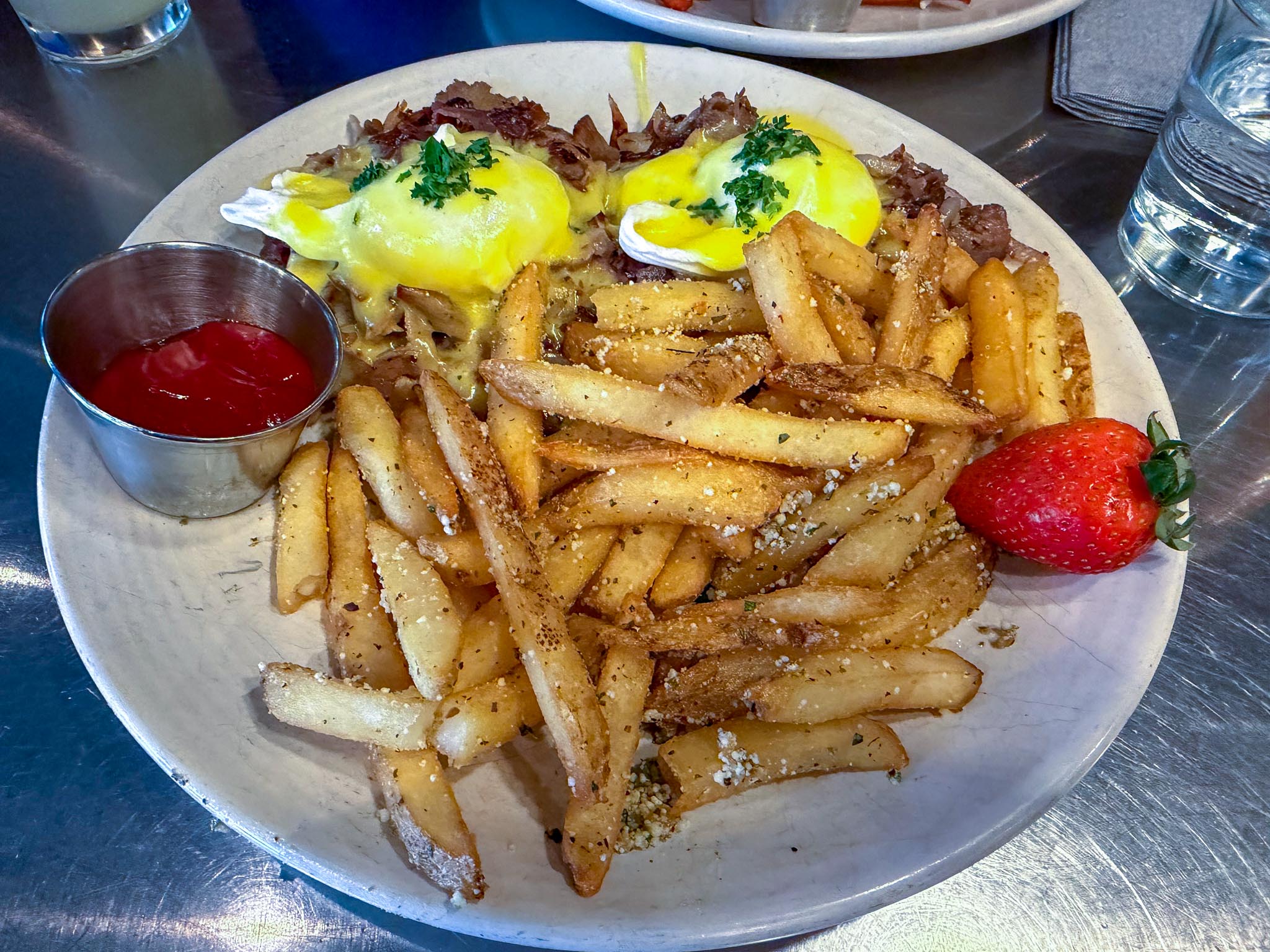Looking for a quick lunch. We walk by so many times here and always see it so busy. We haven’t eaten here in awhile so we finally did again. Andrea had the Panos Burger with sweet potato fries. I had the Lamb Gyro Benedict with the Greek fries. Andrea’s Panos burger is a lamb burger with some feta, Kalamata olive tapenade, and tzatziki. It was quite good. Fries unfortunately were not very fresh so were lukewarm and a bit soggy. My gyro benedict was decent and my fries wer quite flavorful and freshly made (and salty, fatty, starchy things are on of my kryptonites, so I ate way more than I should have). It was a heavy lunch and we were both quite full afterward.
