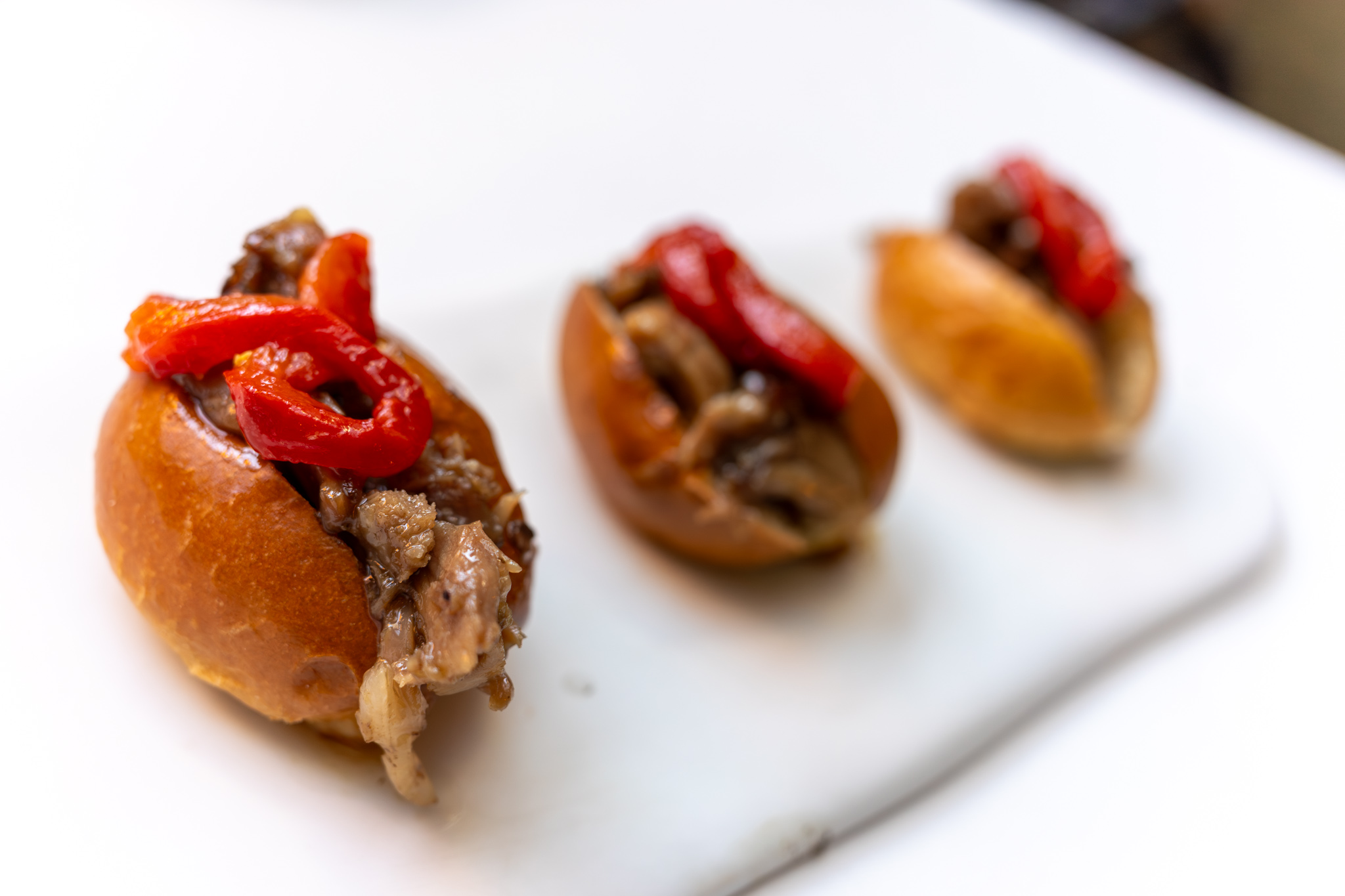 First they gave us some bread from Sant Josep bakery and some “La Gramanosa” EVOO, both of which were quite good. They also gave us an amuse-bouche of lamb in a bun (practically a slider) and bit of roast pepper on top which was quite tasty.