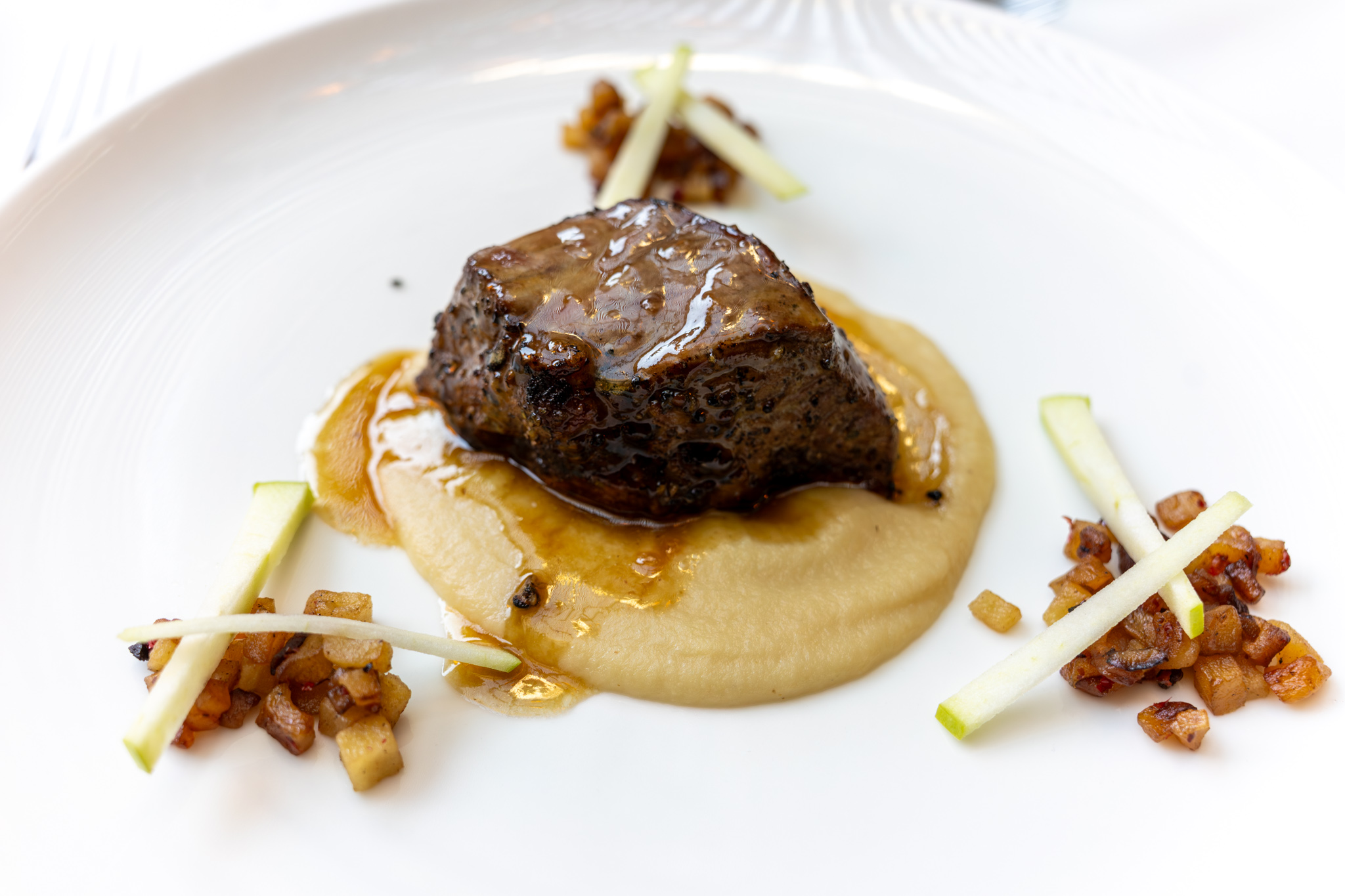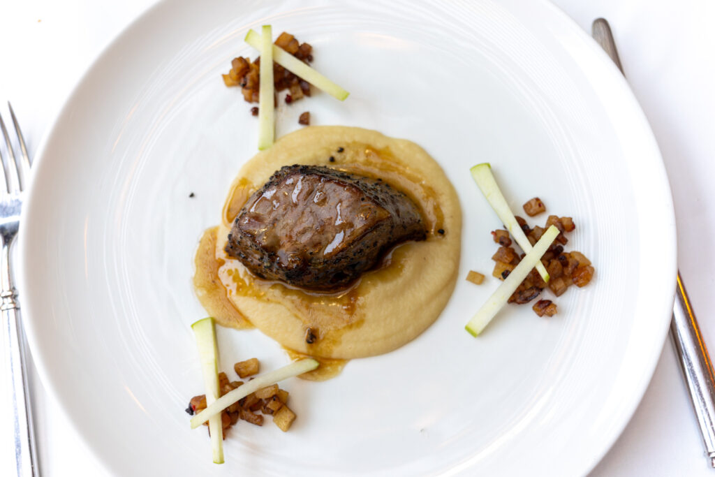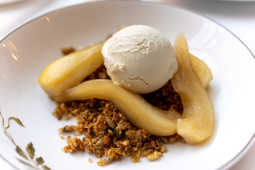 I really enjoyed my mushroom starter…it had good a umami rich flavor of wild mushrooms and the poached eggs sealed the deal for me. When our pork dishes came, first bite was quite good, but as I cut into the meat for the second bite, it was still raw on the inside so I had to send it back (my sister’s pork, which was actually a larger piece, was fine and actually perfectly to temp with a bit of pink still). They did remedy it soon enough and all was good. The warm applesauce was a classic pairing with pork so it of course worked beautifully (of course, we never fail to bring up the Brady Bunch episode where Peter is saying “pork chops and apple sauce” in his version of Humphry Bogart accent…classic). Andrea’s mushroom dish had a strong flavor of raw button mushrooms which I didn’t find that exciting.