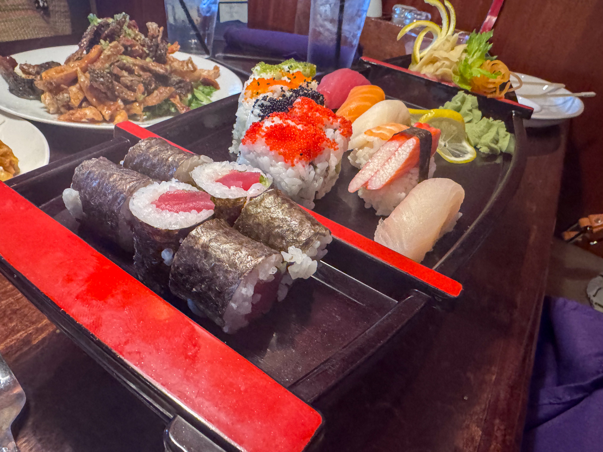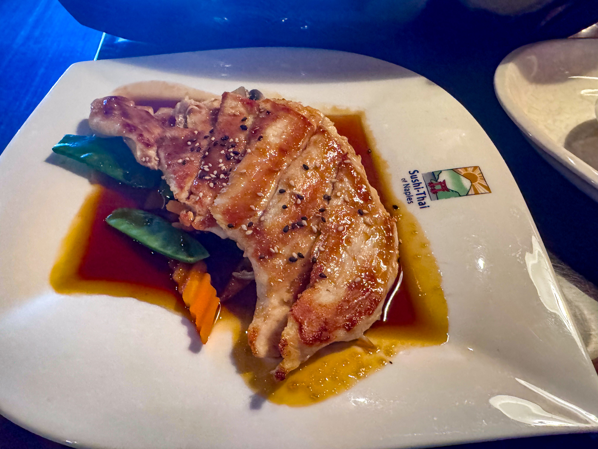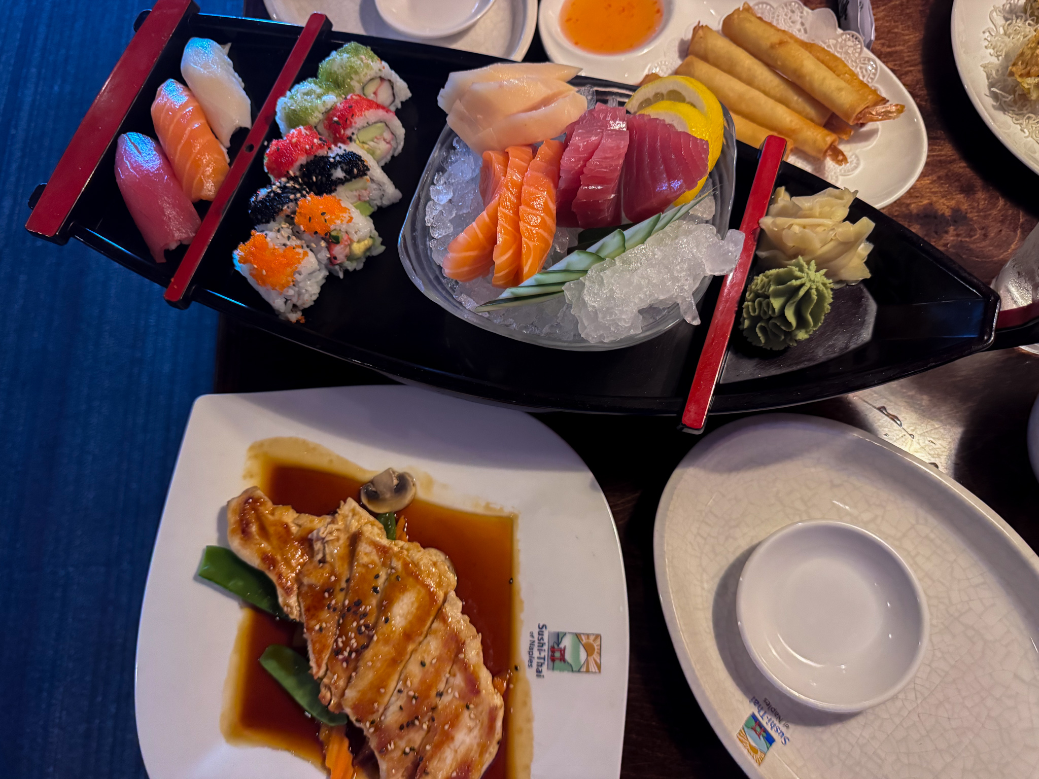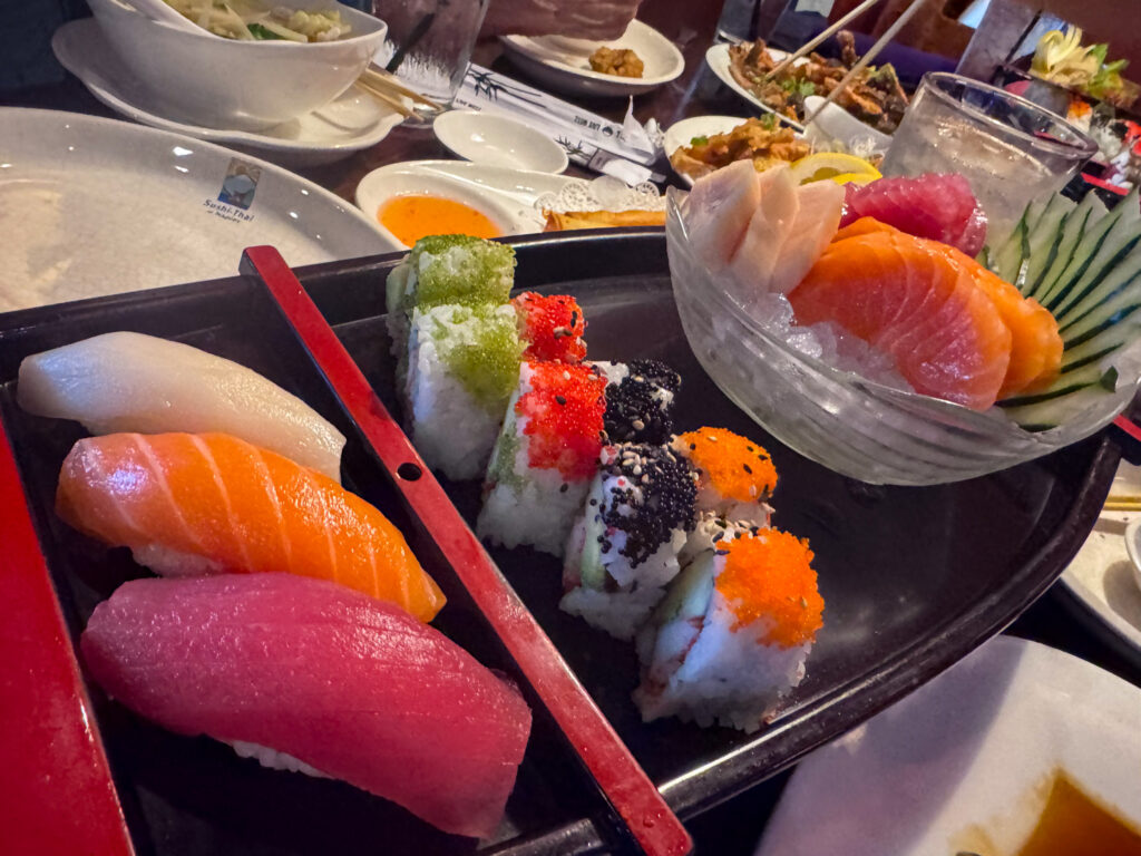 Had dinner out with my sister Ginny, visiting from Lanzarote, and my parents. Went to one of their usual places, Sushi-Thai. Not surprisingly, their menu has both Thai food and sushi, I’m guessing to better appeal to the locals with a pan-Asian menu (I’m also assuming that Japanese cuisine is more popular/mainstream than Thai). I’m always a bit skeptical of a place that does multiple cuisines as well as seafood on a Monday.
