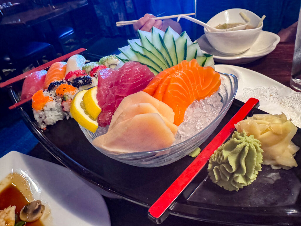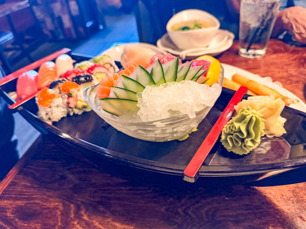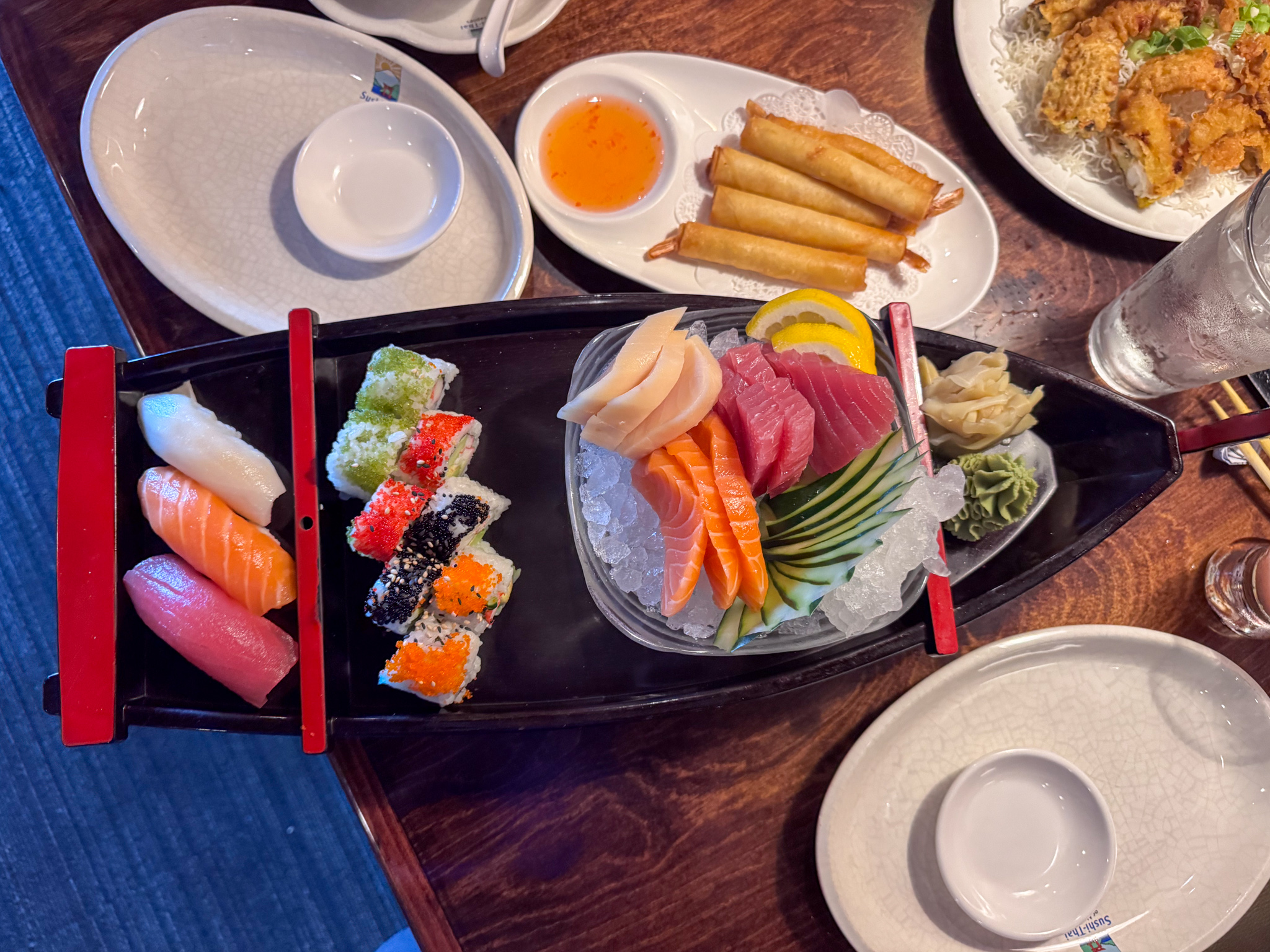 I ended up ordering the sushi/sashimi/chicken teriyaki combo which ended up being a huge sushi boat with a california roll, sashimi, and some nigiri as well as the chicken teriyaki. It was a ridiculous amount of food. I did eat the sashimi and the sushi (all pretty meh), about half of the chicken teriyaki, and only one piece of the California roll. It was all mediocre, but for the money it was an impressive amount of food.