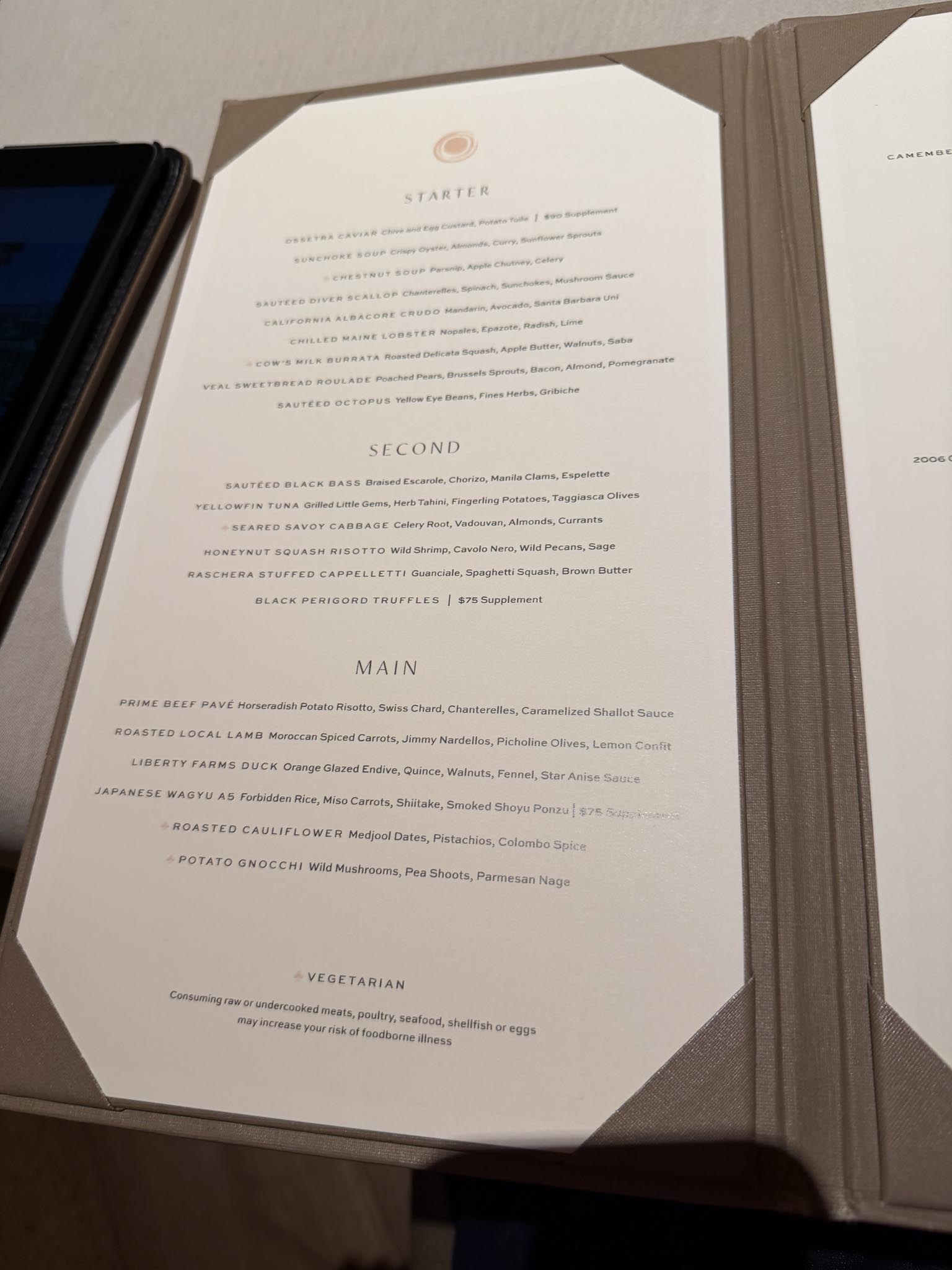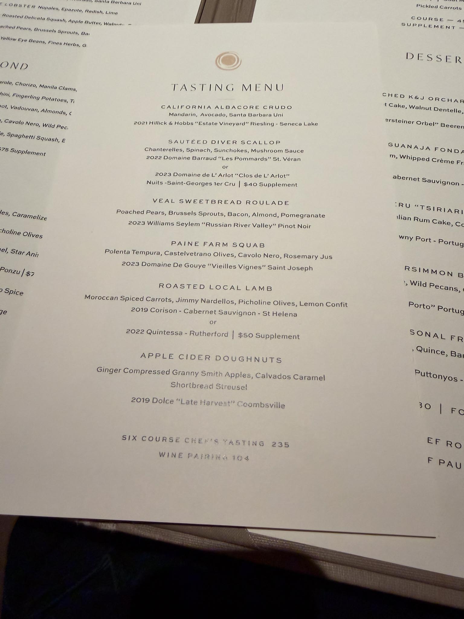 The resort seemed very uncrowded this time of year and mid-week and the dining room was the same with two or three other parties seated. They have a 3 or 4 course prix fixe or their tasting menu. My wife went with 3 courses and I went with the 6-course tasting menu and wine pairing.