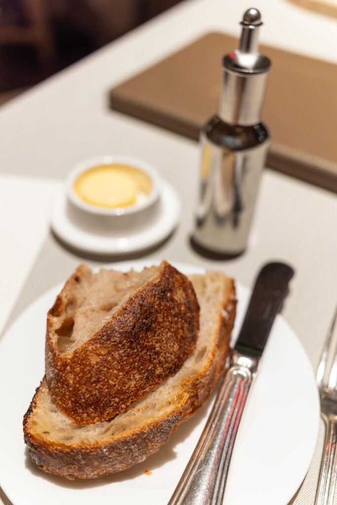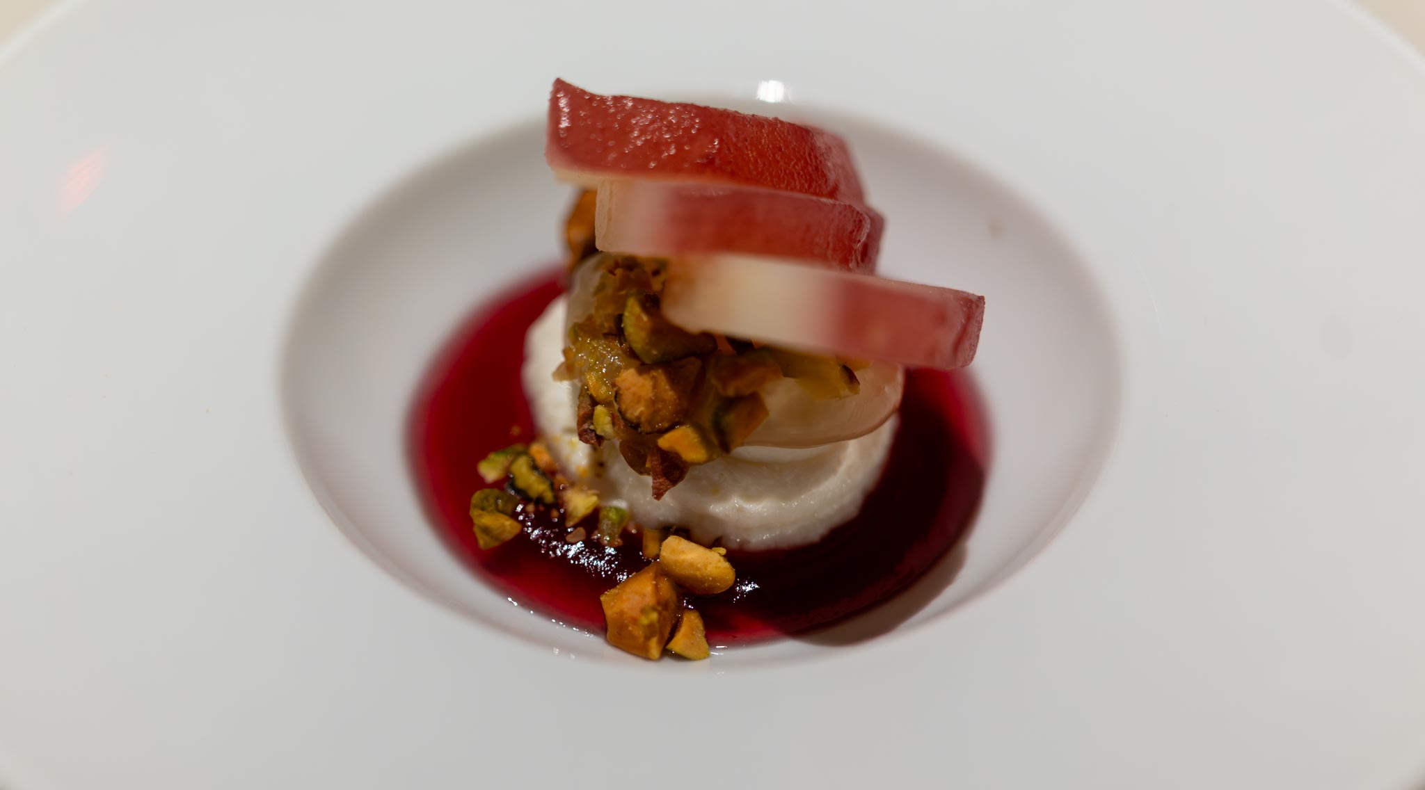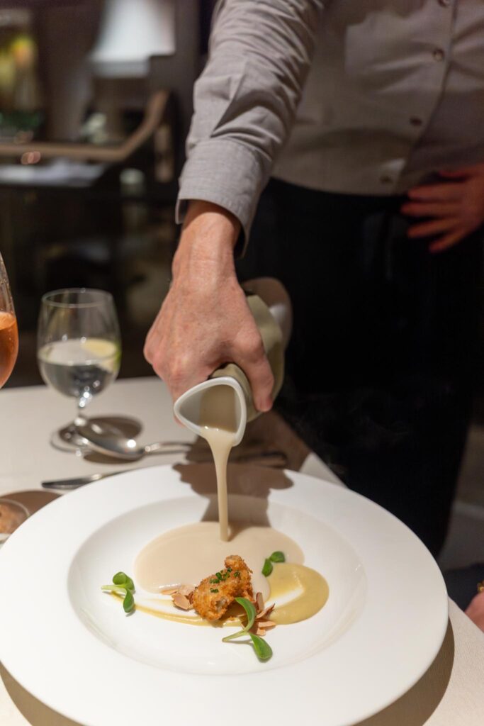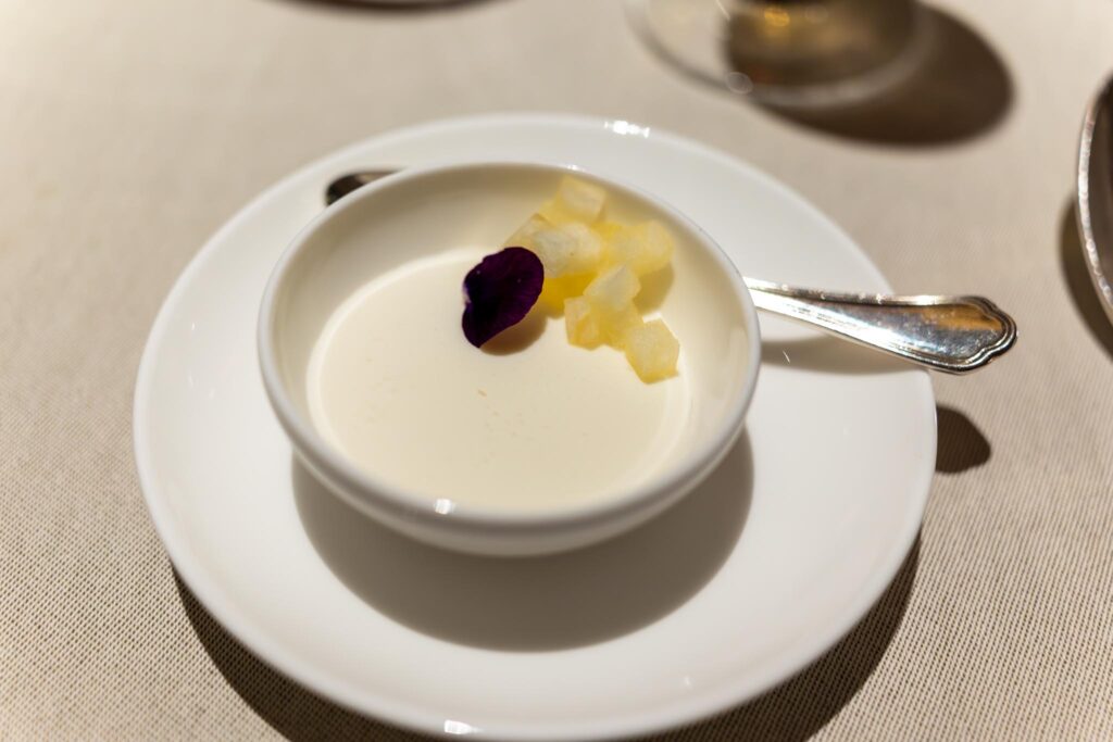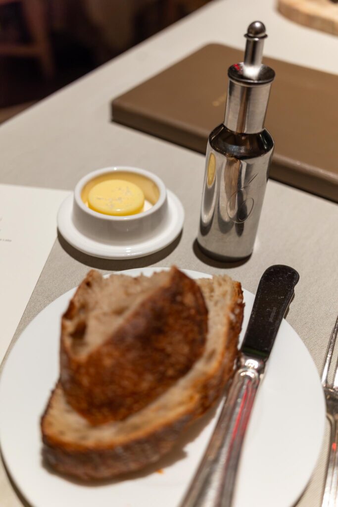 Our first bite was an amuse bouche of a little toast with some whipped creme fraiche and golden osetra caviar. Always a nice start. Bread was served along with some butter both of which were decent. The next bite they gave us had some verjus gellée, ricotta, wine poached pear, and pistachio. Sadly, this made of this think of hotel dining room food, which technically it was, but it seemed not particularly impressive from a Michelin starred restaurant. Fortunately, things did eventually get a bit better.