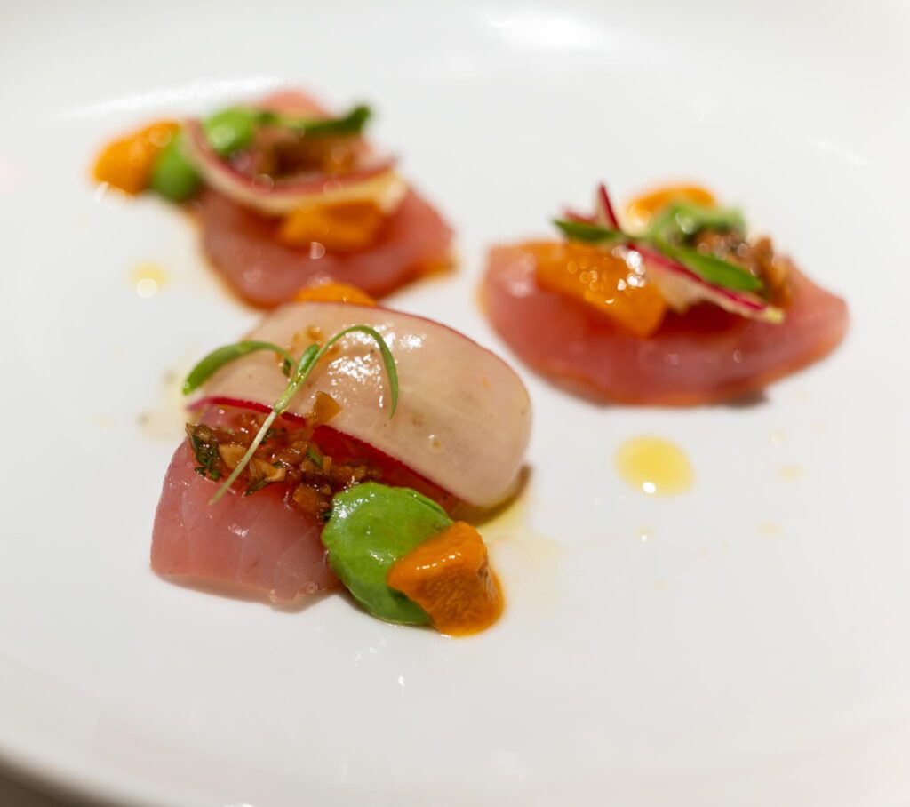 My first dish was the California Albacore Crudo which a slice of mandarin orange, and a bit of a blended avocado and a dab of uni. There was also some crispy garlic on the dish which really popped. The garlic was pretty overpowering, but I liked the dish anyway.