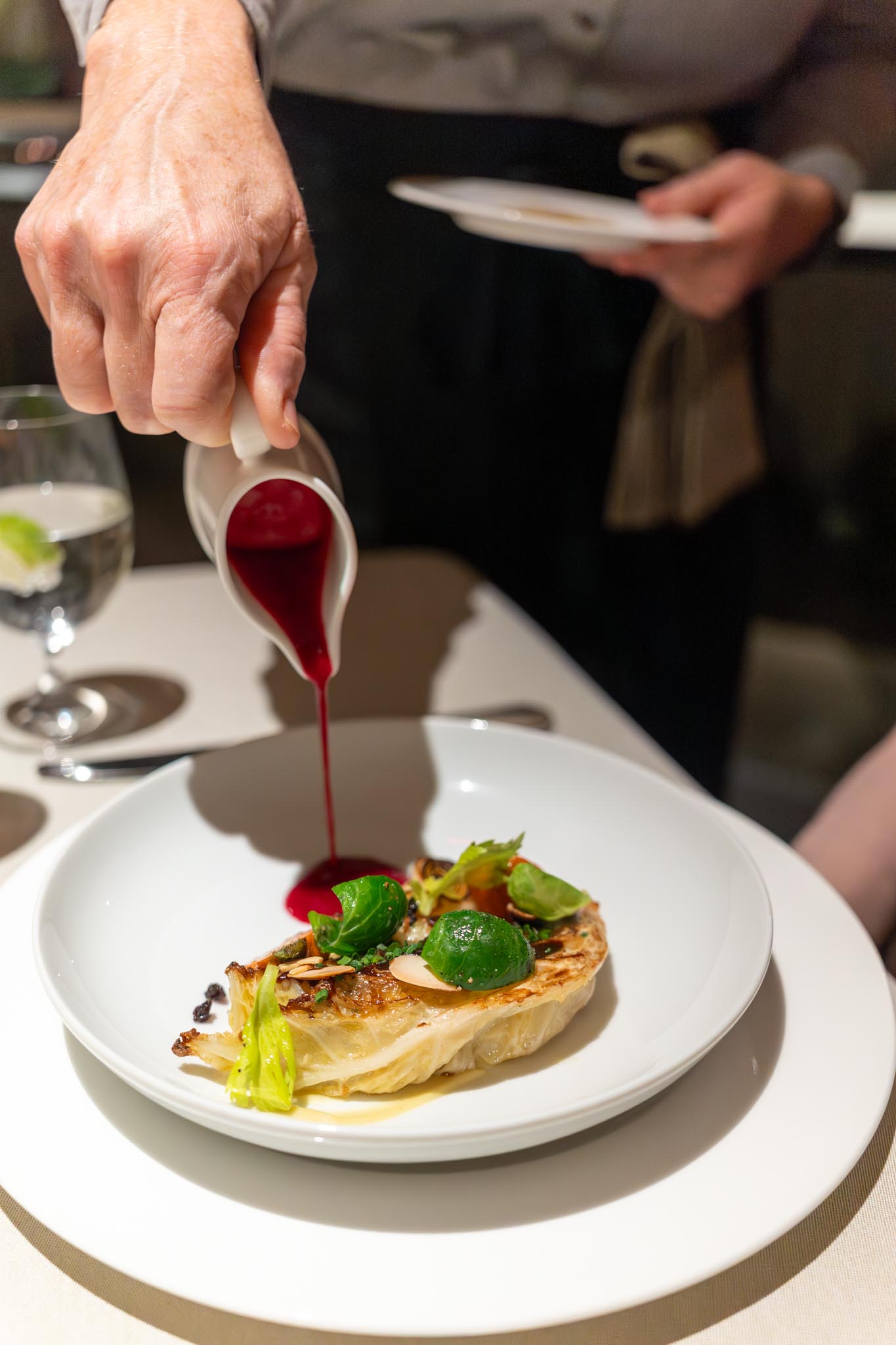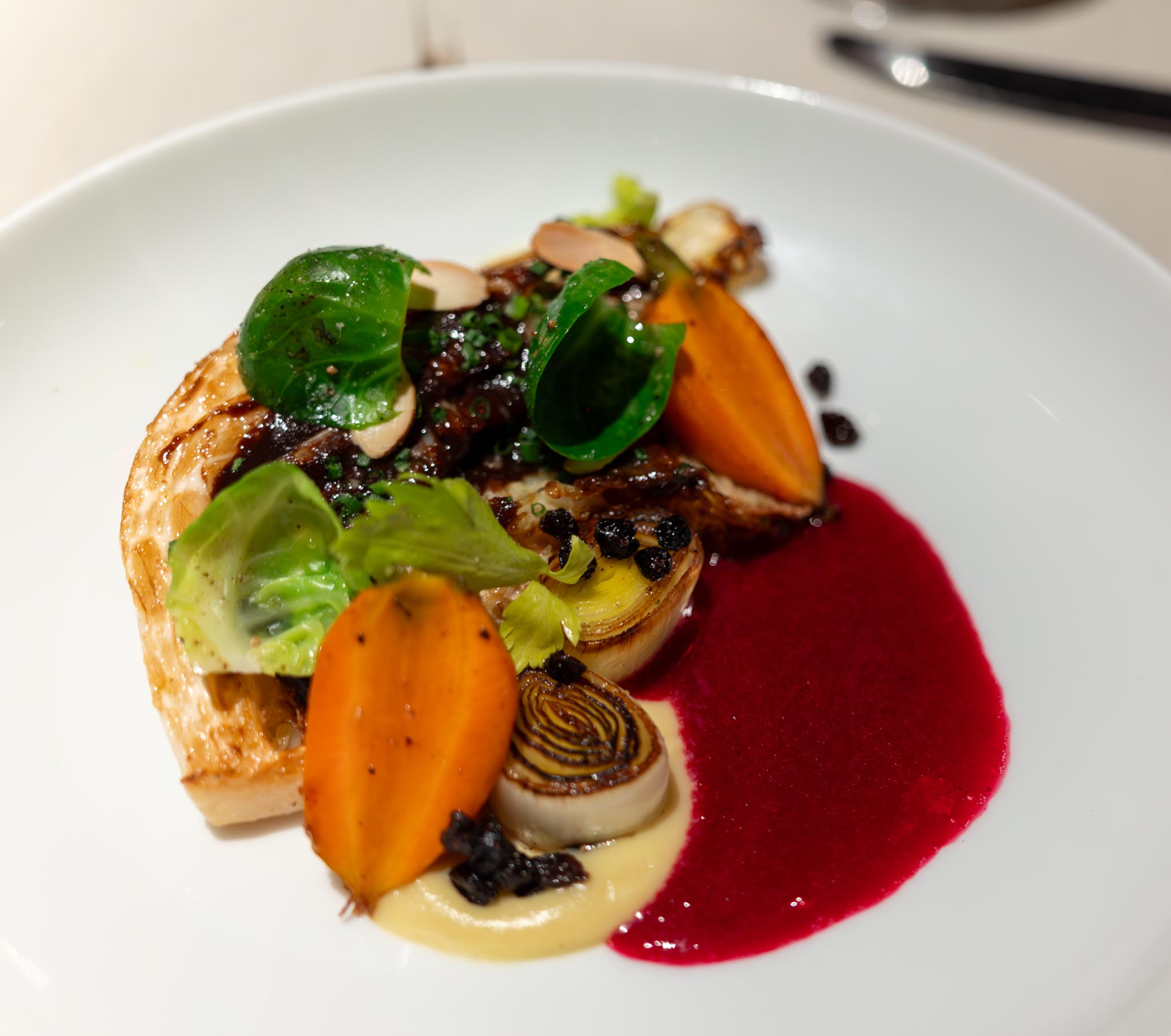 Andrea’s next course was the Seared Savoy Cabbage. This cam eiwh an array of vegetables – onion, carrots, celery root, brussel sprout leaves, currants, almond slivers, and a vadouvan sauce. It was very vegetable forward as expected.