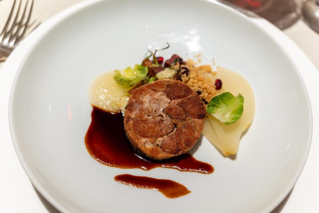 My dish was the Veal Sweetbread Roulade which was a dish to which I had been looking forward. The slice of the roulade appeared to also have been fried or roasted for a bit which was good. It came with some poached pears, some brussel sprout leaves and some bacon that was really more like pancetta.