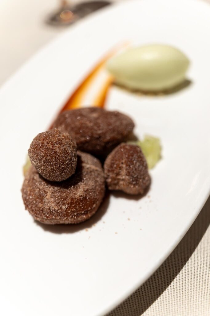 For a palette cleanser, I was given a pear panna cotta which was nice. For my dessert, it was Apple Cider Doughnuts. This consisted of mini doughnuts and donut holes made of shortbread streusel dusted with sugar. Three was a streak of Calvados caramel and some diced ginger compressed Granny Smith apples and a quenelle of apple ice cream. It was an ok dessert, but I did appreciate the apple leitmotif.