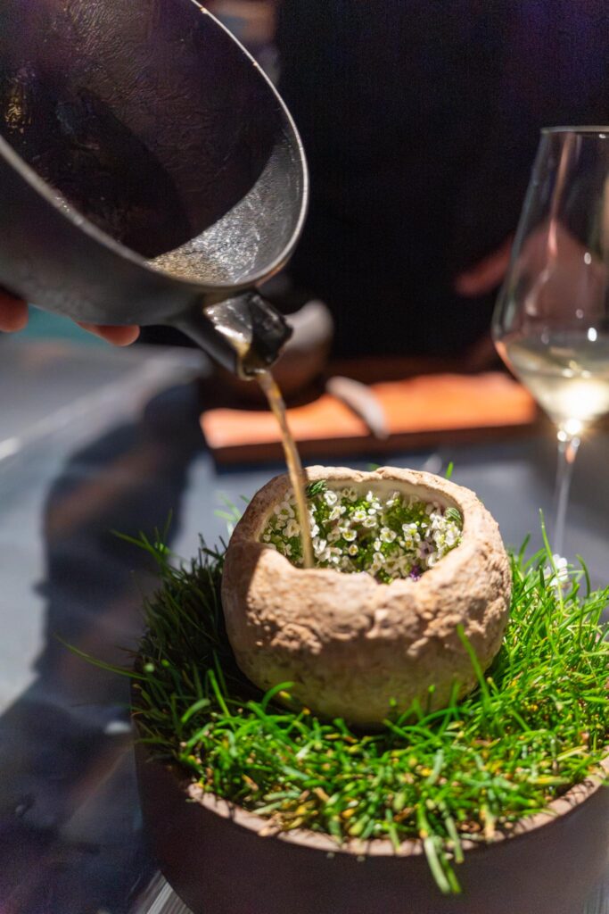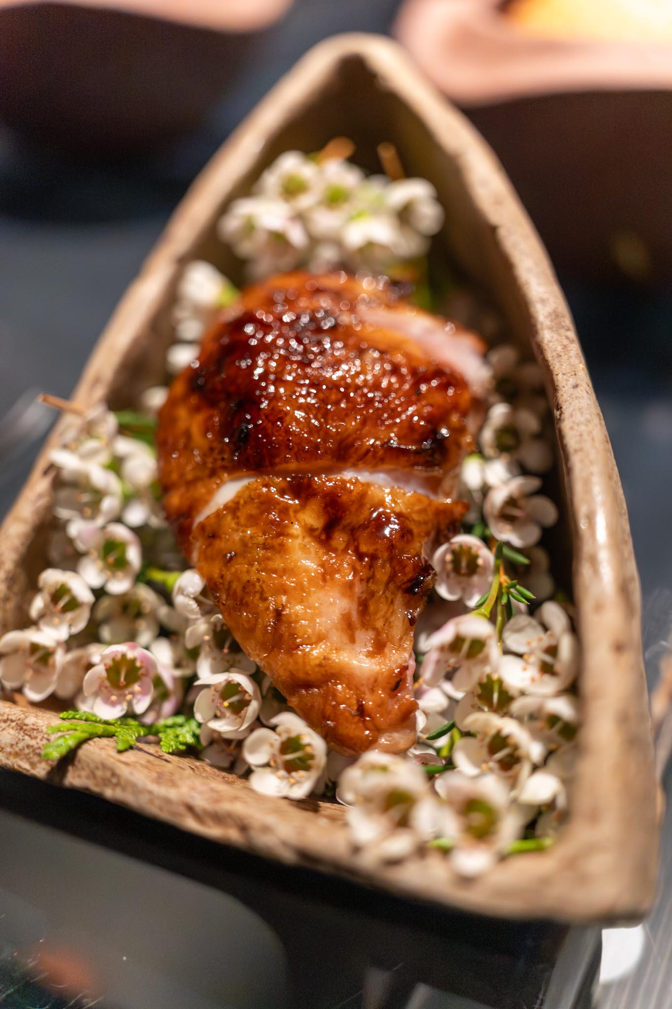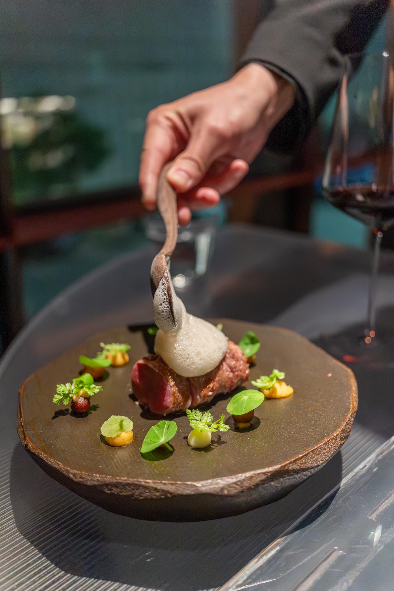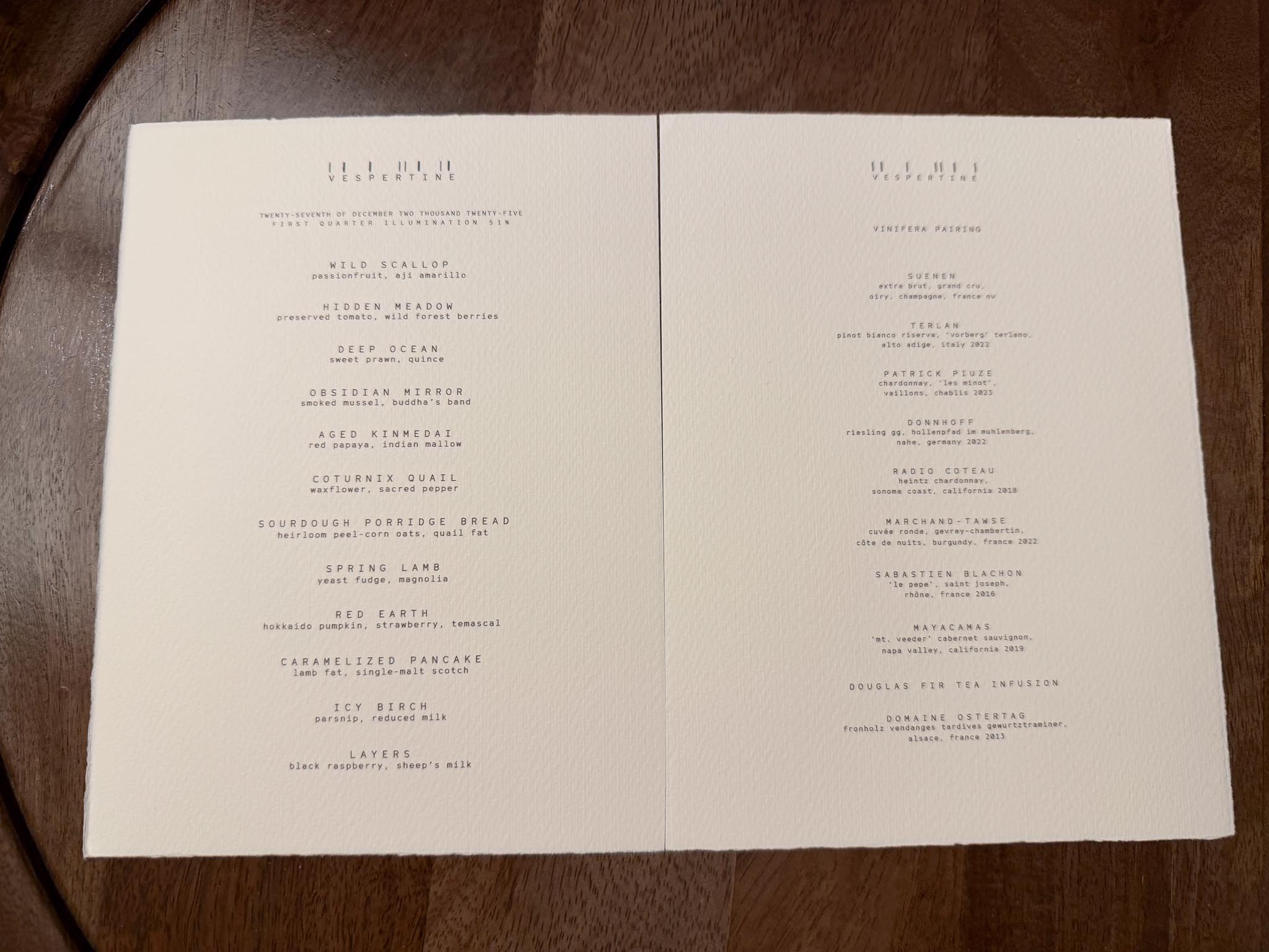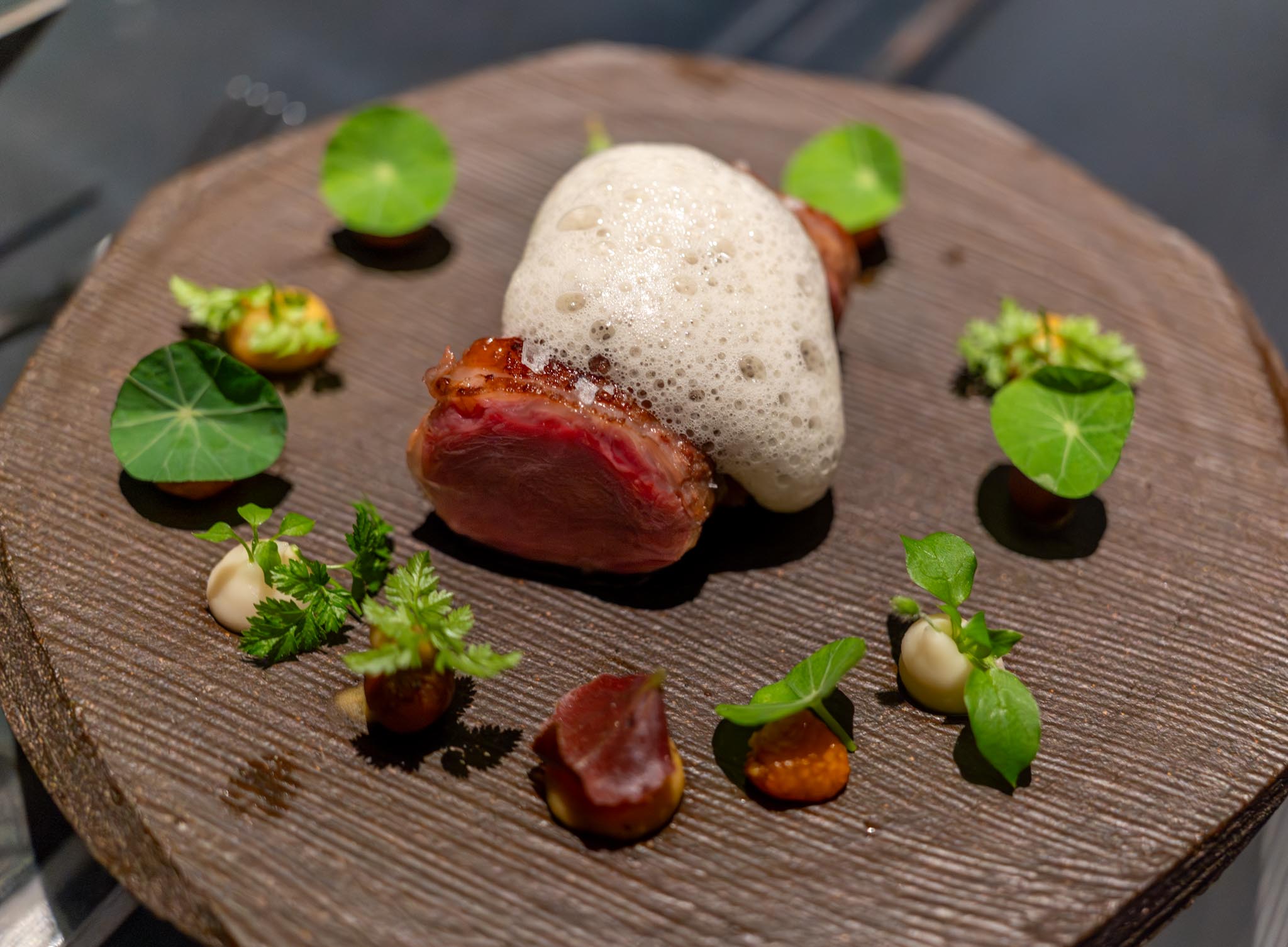 This reads as a pivot point: the transition into land proteins. Quail is delicate but flavorful, and waxflower plus sacred pepper suggests aromatic, floral spice rather than heat. We’re imagining something gently roasted, maybe pink, with a sauce that leans perfume-forward. Could be a standout if the balance is right.