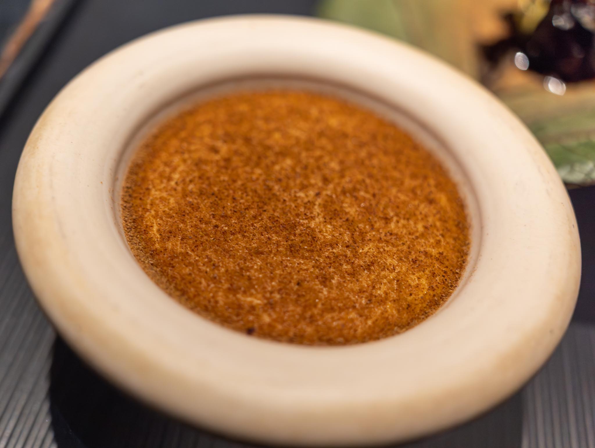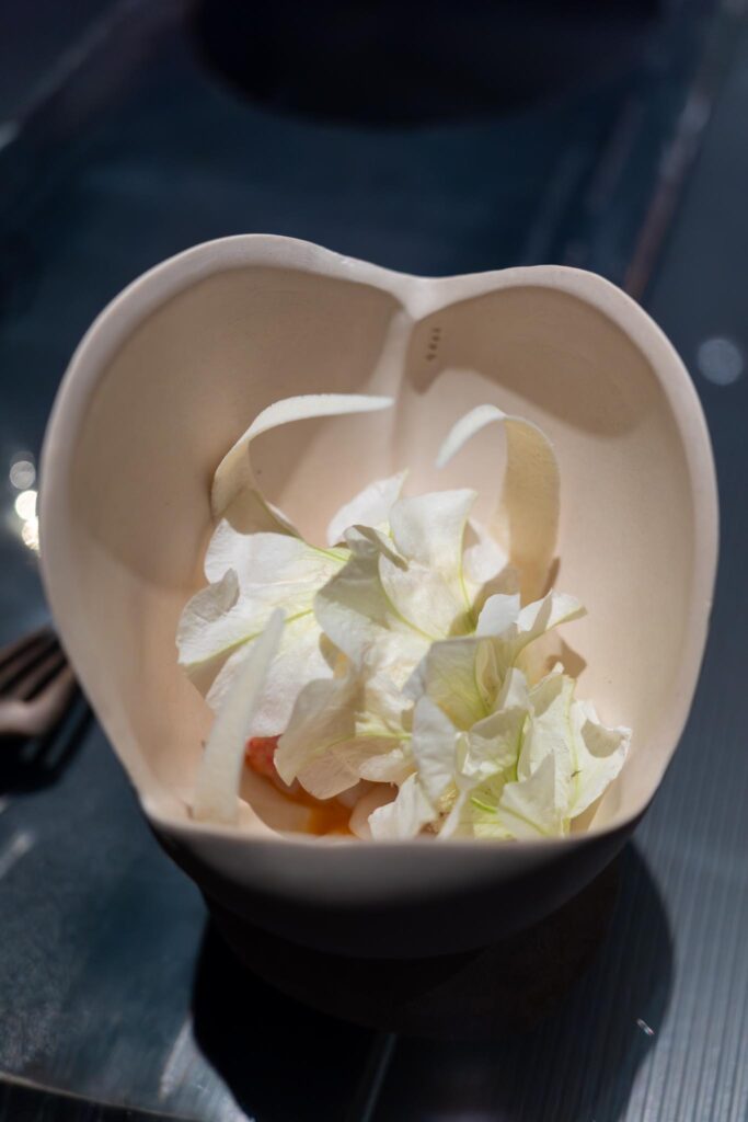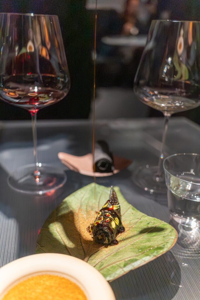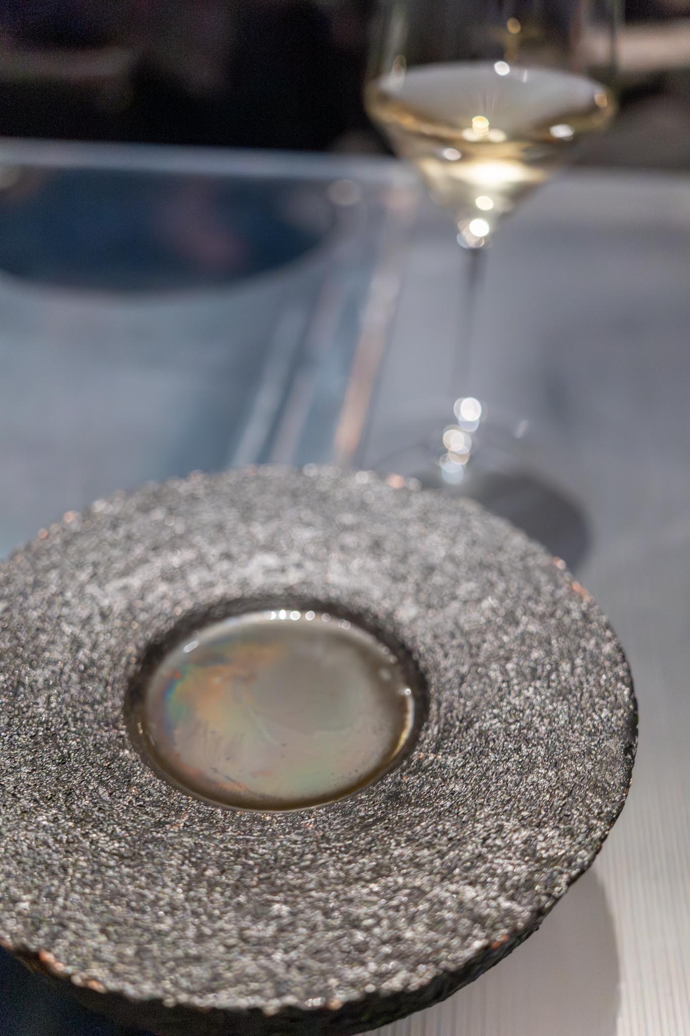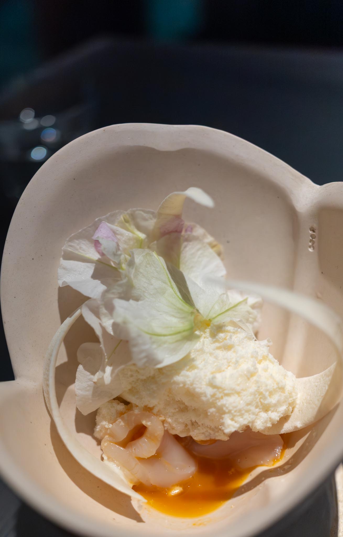 This feels like a very deliberate opening bite: clean, sweet scallop paired with acidity and gentle heat. Passionfruit brings brightness and perfume, while aji amarillo usually adds warmth rather than real spice. We’re guessing this is lightly cured or just barely dressed, meant to wake you up without overwhelming the scallop itself. Likely refreshing, probably very clean, and hopefully not too sweet (always the risk with passionfruit).