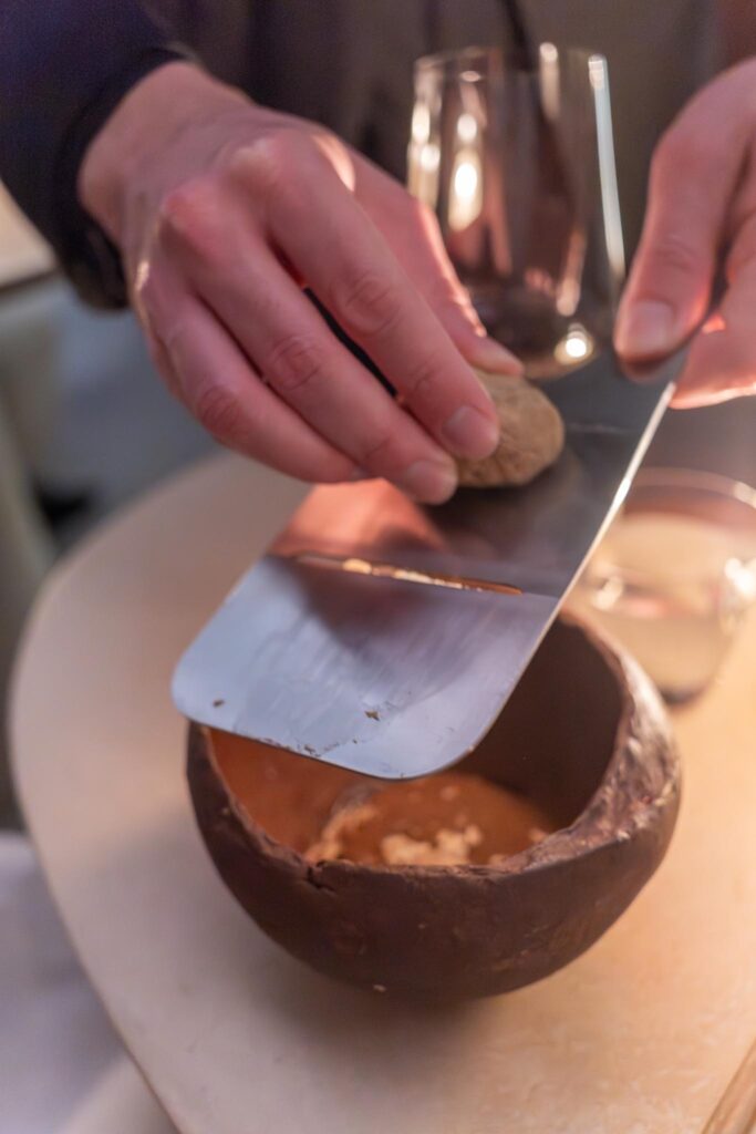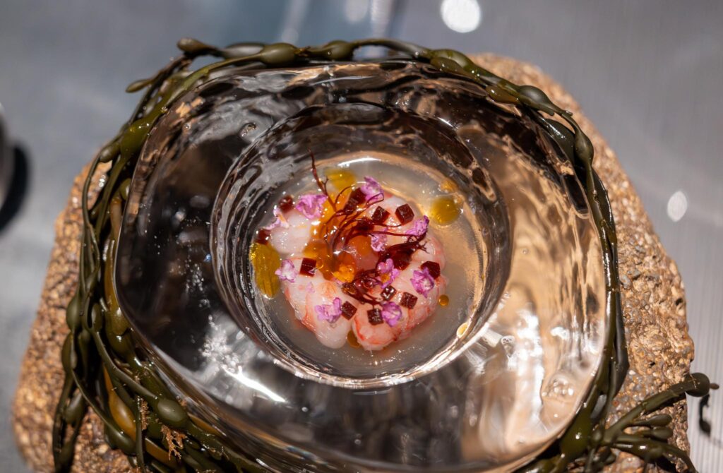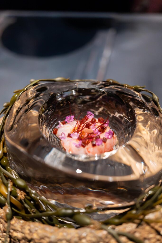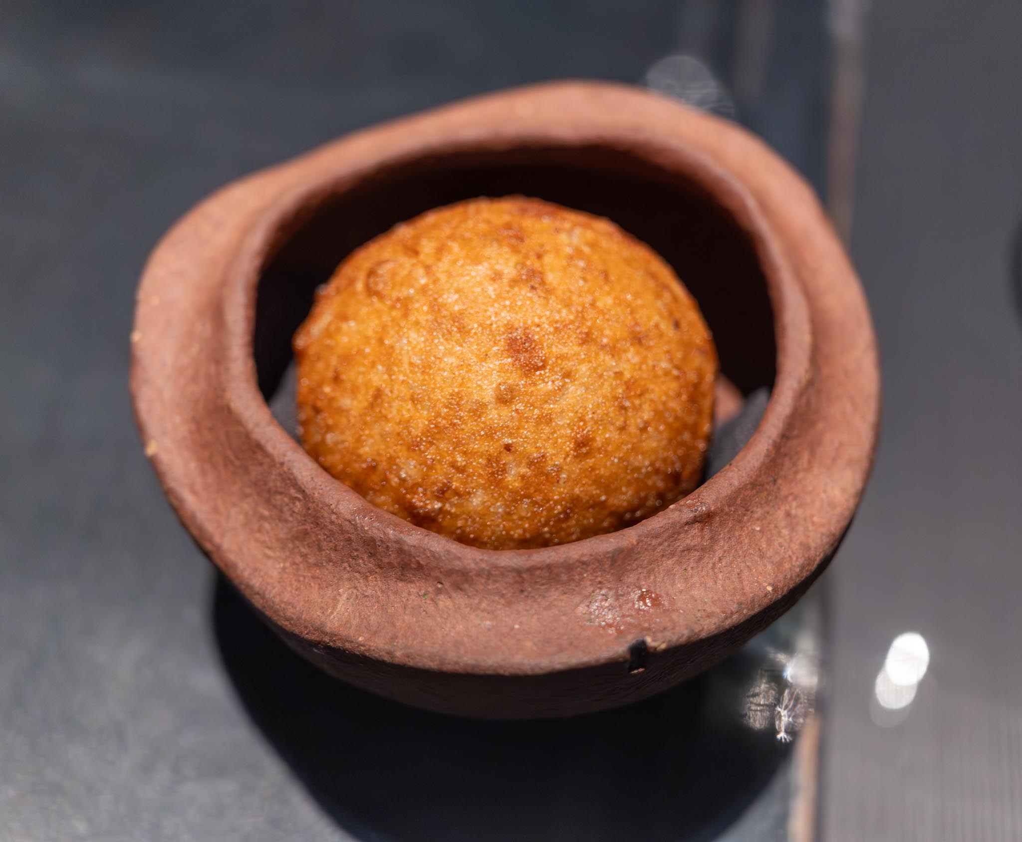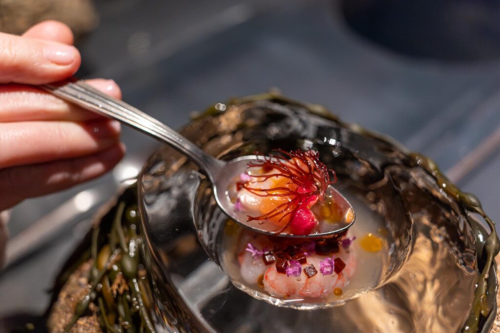 This feels like a very deliberate opening bite: clean, sweet scallop paired with acidity and gentle heat. Passionfruit brings brightness and perfume, while aji amarillo usually adds warmth rather than real spice. We’re guessing this is lightly cured or just barely dressed, meant to wake you up without overwhelming the scallop itself. Likely refreshing, probably very clean, and hopefully not too sweet (always the risk with passionfruit).