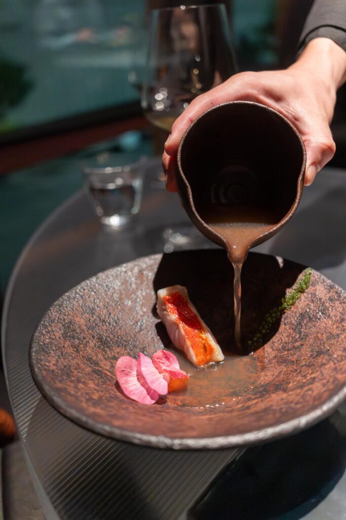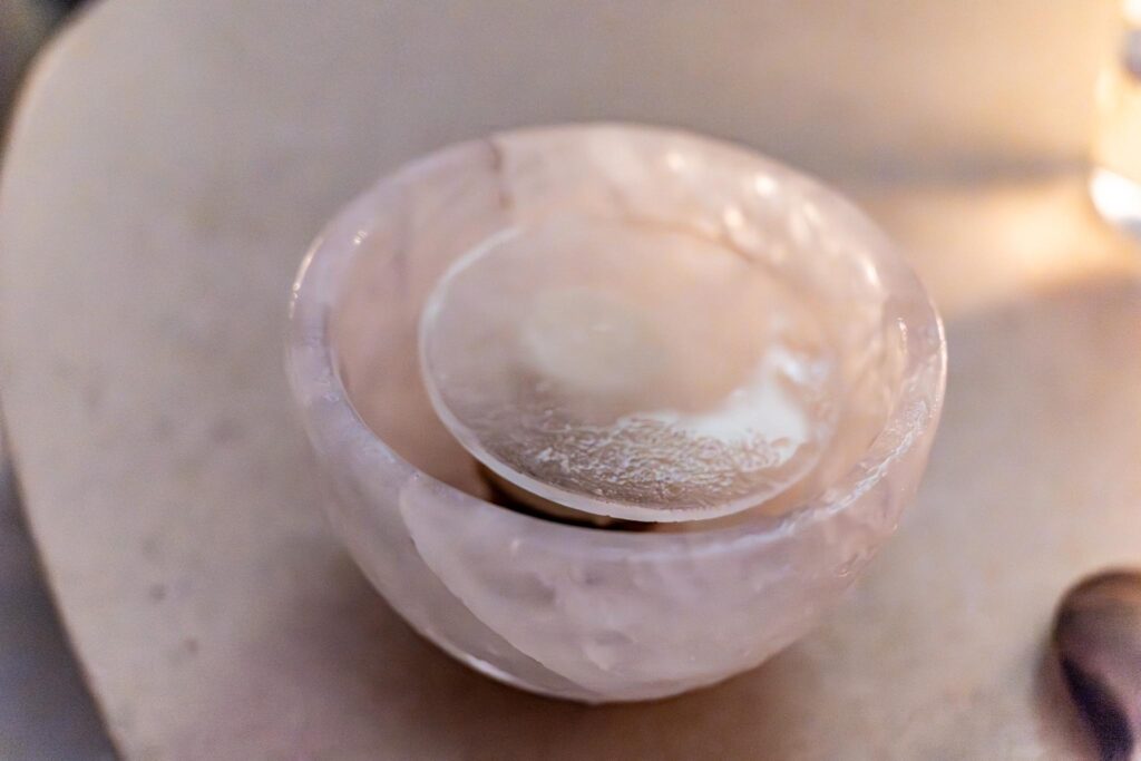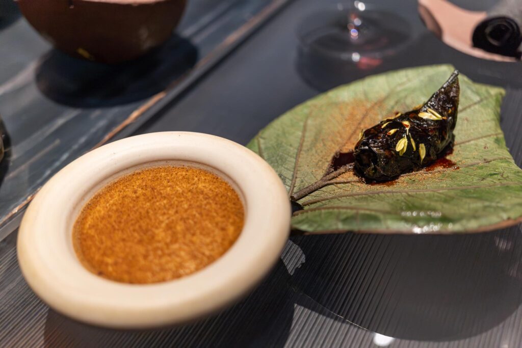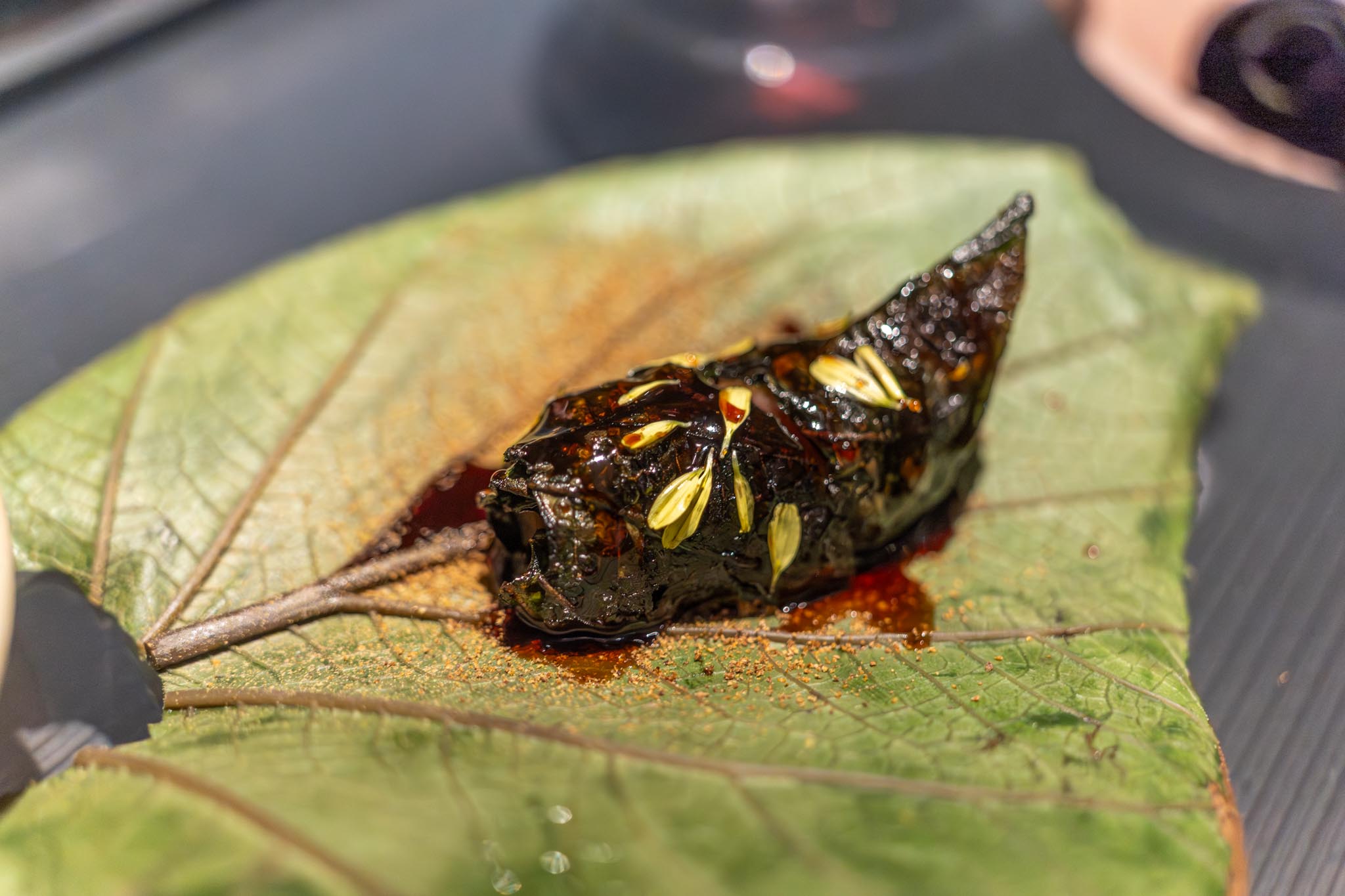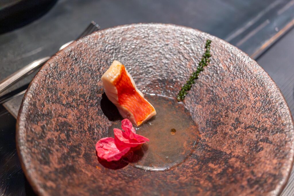 Aged kinmedai implies confidence (and patience). Aging should bring out fat and umami in the fish, while papaya adds gentle sweetness and Indian mallow brings something herbaceous and green. This feels like a “trust us” dish—probably subtle, probably one of the more refined courses, and likely better appreciated if you’re already settled into the meal.