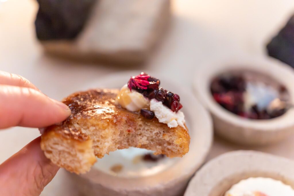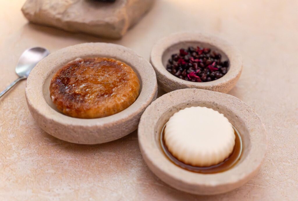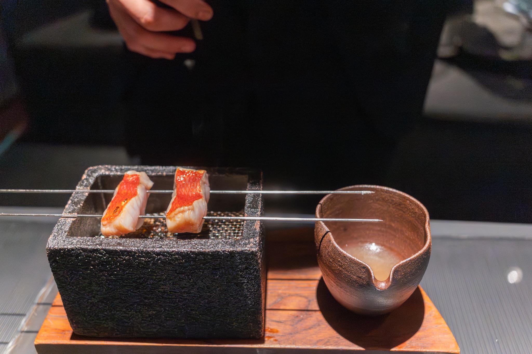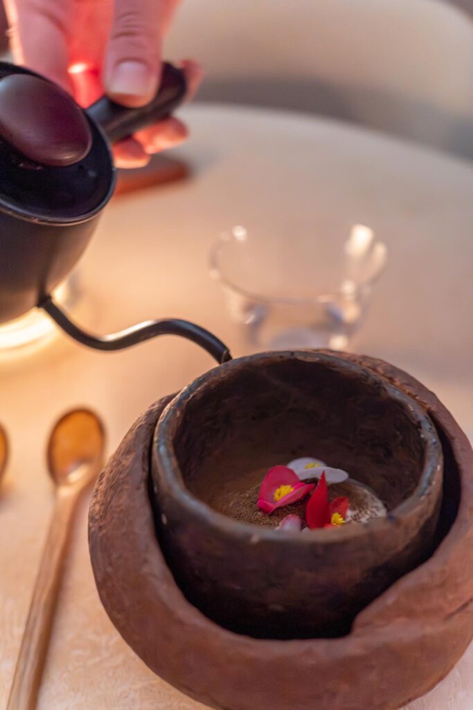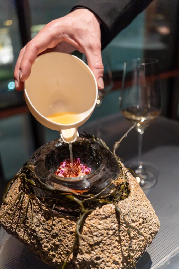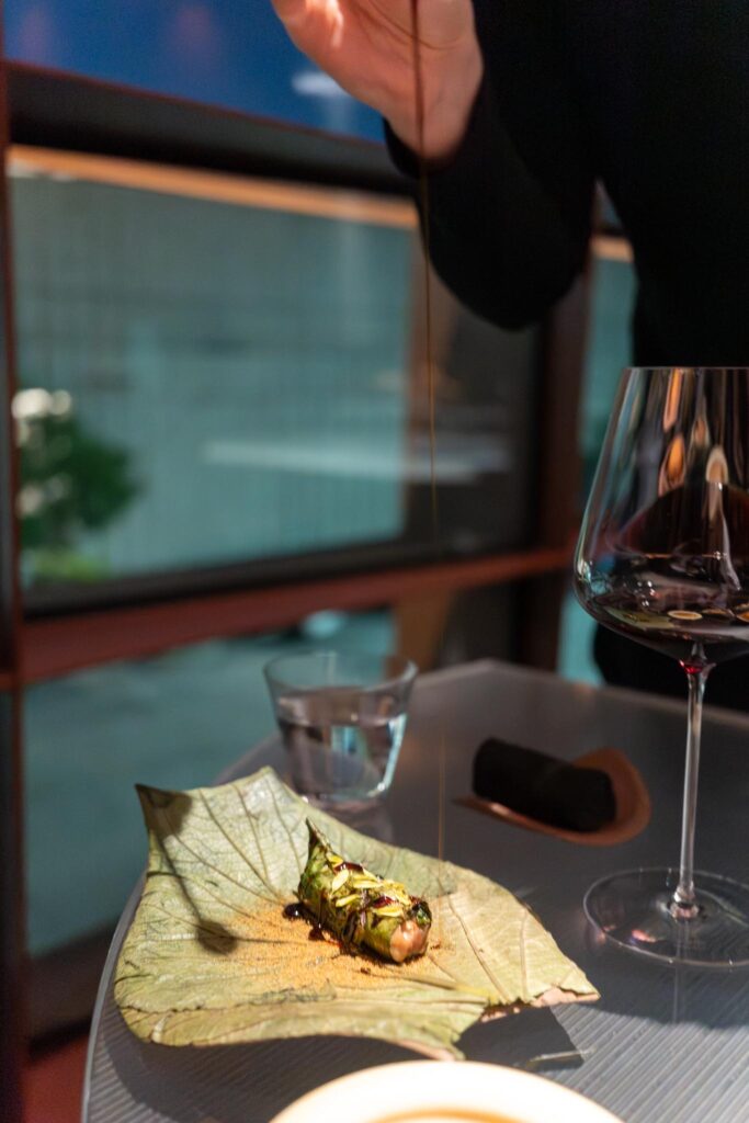 Aged kinmedai implies confidence (and patience). Aging should bring out fat and umami in the fish, while papaya adds gentle sweetness and Indian mallow brings something herbaceous and green. This feels like a “trust us” dish—probably subtle, probably one of the more refined courses, and likely better appreciated if you’re already settled into the meal.