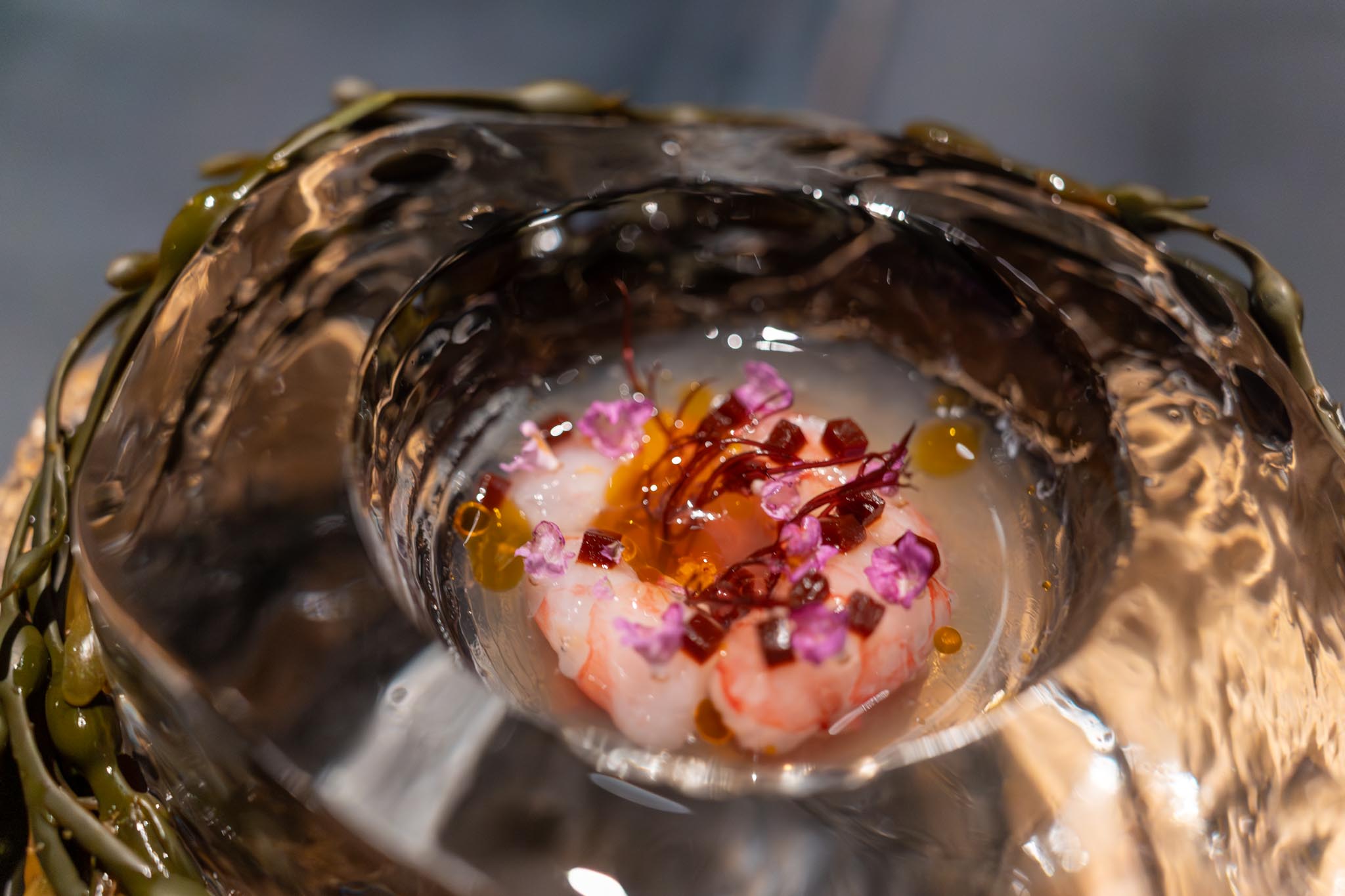 Sweet prawn is doing most of the heavy lifting here, with quince adding floral sweetness and mild tannin. This feels like a texture-driven course—soft, almost creamy prawn against something gently firm or gelled from the quince. Likely elegant, possibly one-dimensional if not handled carefully, but the pairing makes sense on paper.