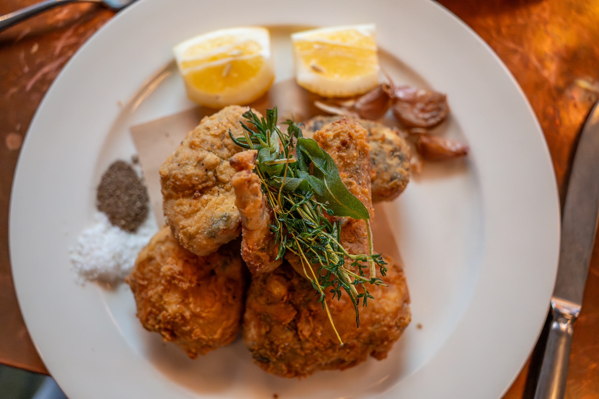 We started with a dozen oysters which came as the chef’s selection of west coast and east coast oysters. We asked which ones they were and our server wasn’t sure, but told what she had written down in our notepad, but we had never heard of either one. I thought the oysters were ok, not the freshest we’ve had, but not bad. We did like the house-made hot sauce though that was made with Fresno peppers.