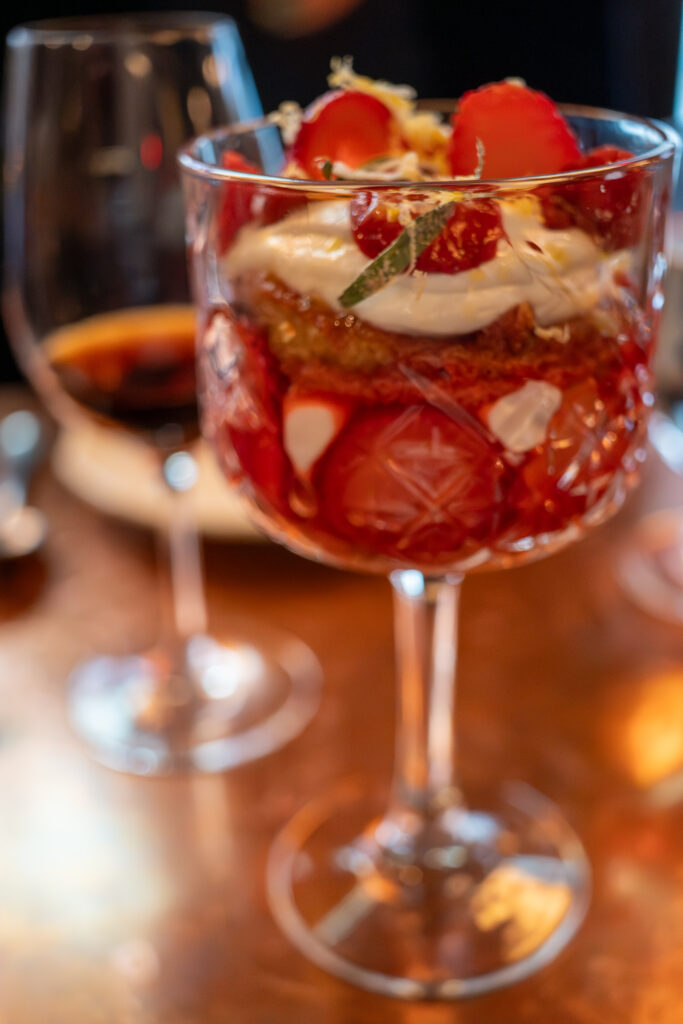 For dessert, we went with the olive cake (something we rarely see on menus. I think the last time we had olive oil cake was when we were at the olive oil mill Bastide du Laval) which we were warned that it came as more of a parfait which we had seen earlier at a neighboring table and since we wanted something a little bit on the lighter side, this worked out great. It definitely featured more of the pressed strawberries and the whipped cream than the olive oil cake.